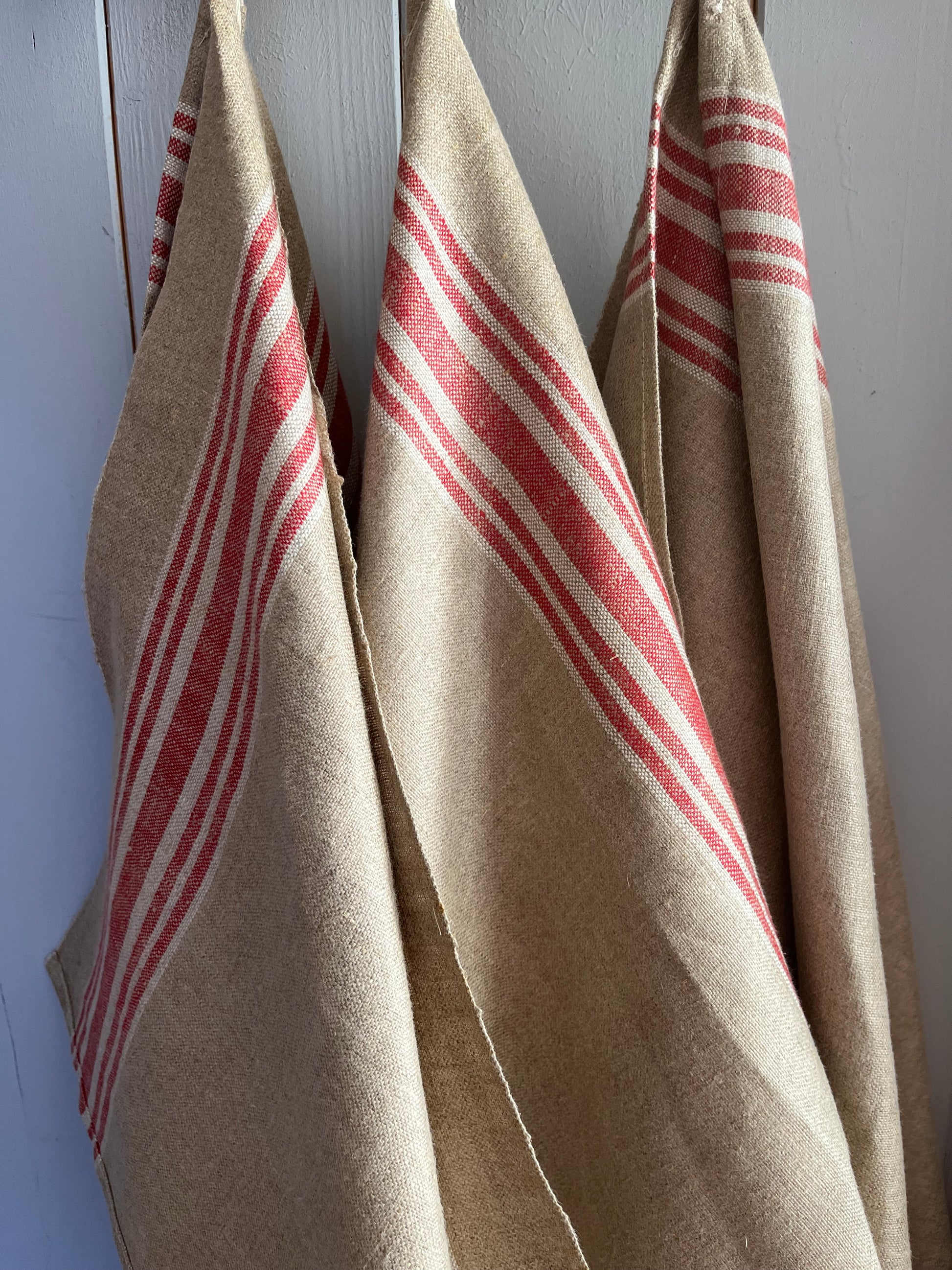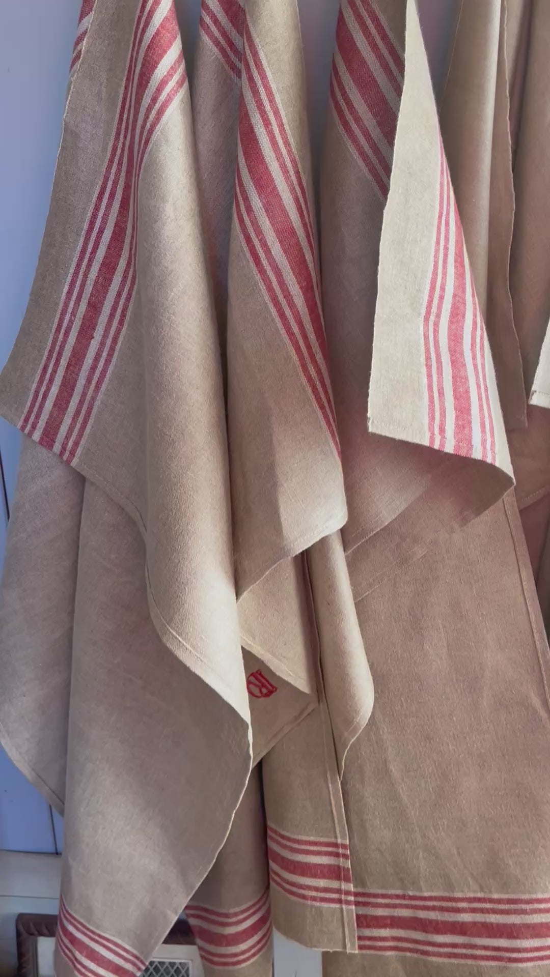 Aus altem Leinen genähtes Tuch mit tiefroten und weißen Streifen oben und unten. Maße: ca. 90 × 47 cm. Leinenfarbe: ein dunkles Beige. Das Tuch ist schön erhalten, unbenutzt. Aber immer bedenken: es ist antikes, altes Leinen, Lagerspuren können immer mal irgendwo auftauchen. Sie machen den Charme der alten Stücke aus. Auch als Tischläufer zu verwenden. Aufhänger vorhanden. Vor dem ersten Einsatz als Küchentuch oder im Badezimmer ein, bis zweimal waschen. Mit jedem Waschgang verliert das Leinen seine natürliche Wachsschicht und nimmt Feuchtigkeit immer besser auf.