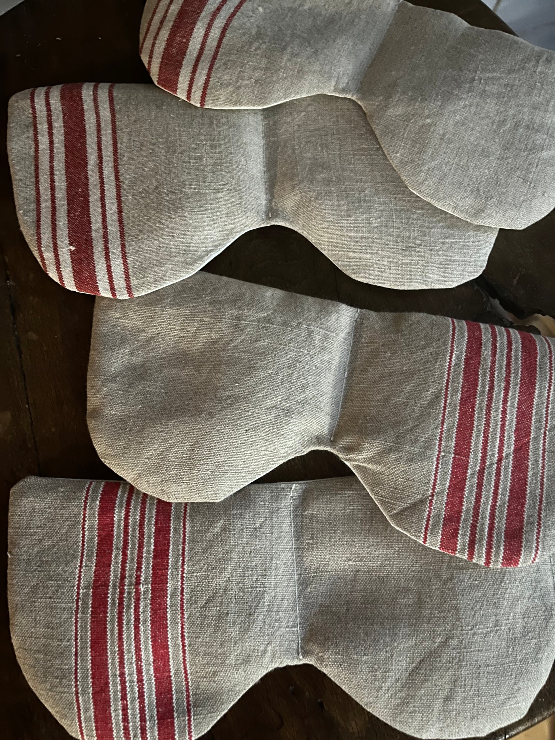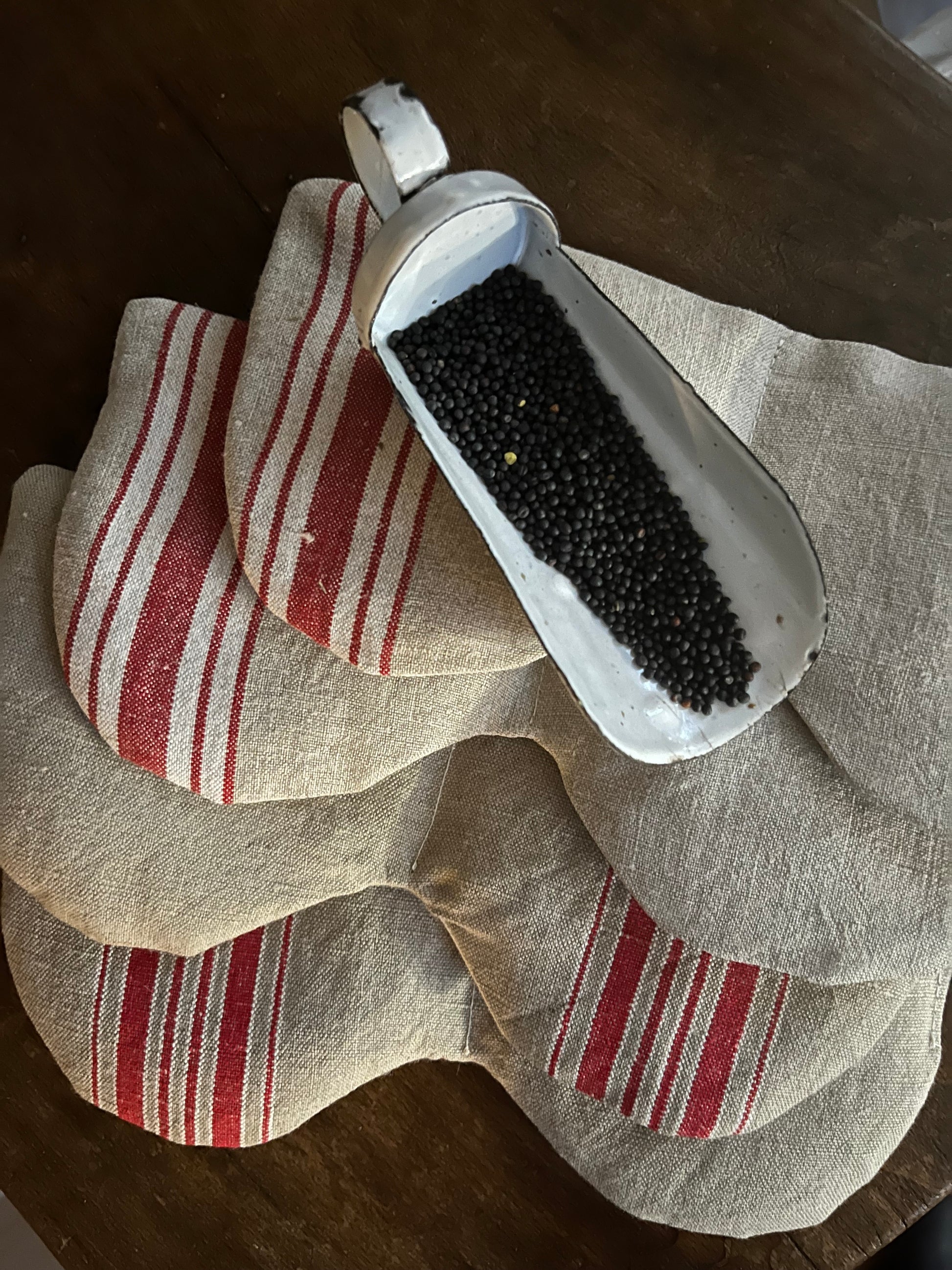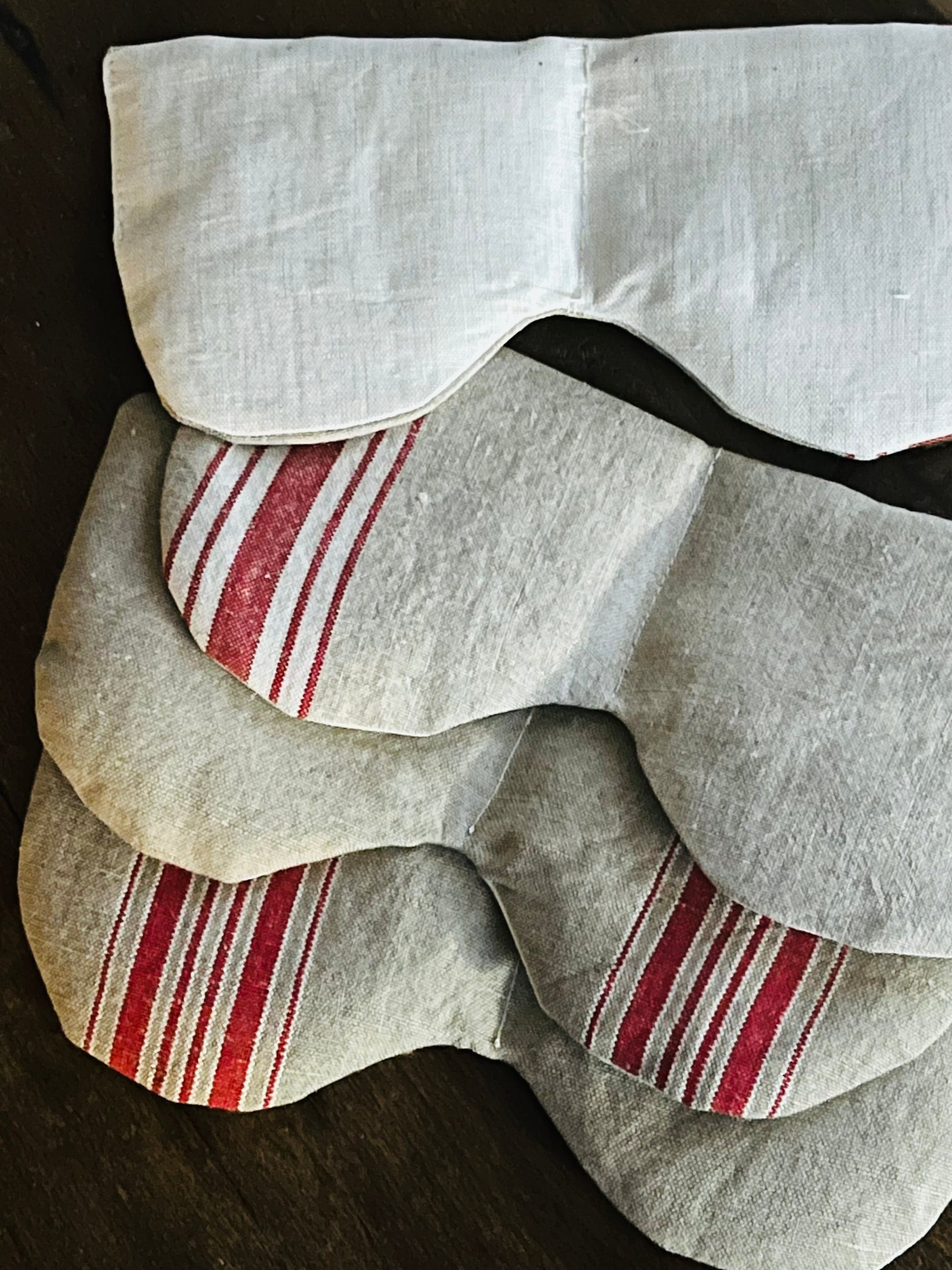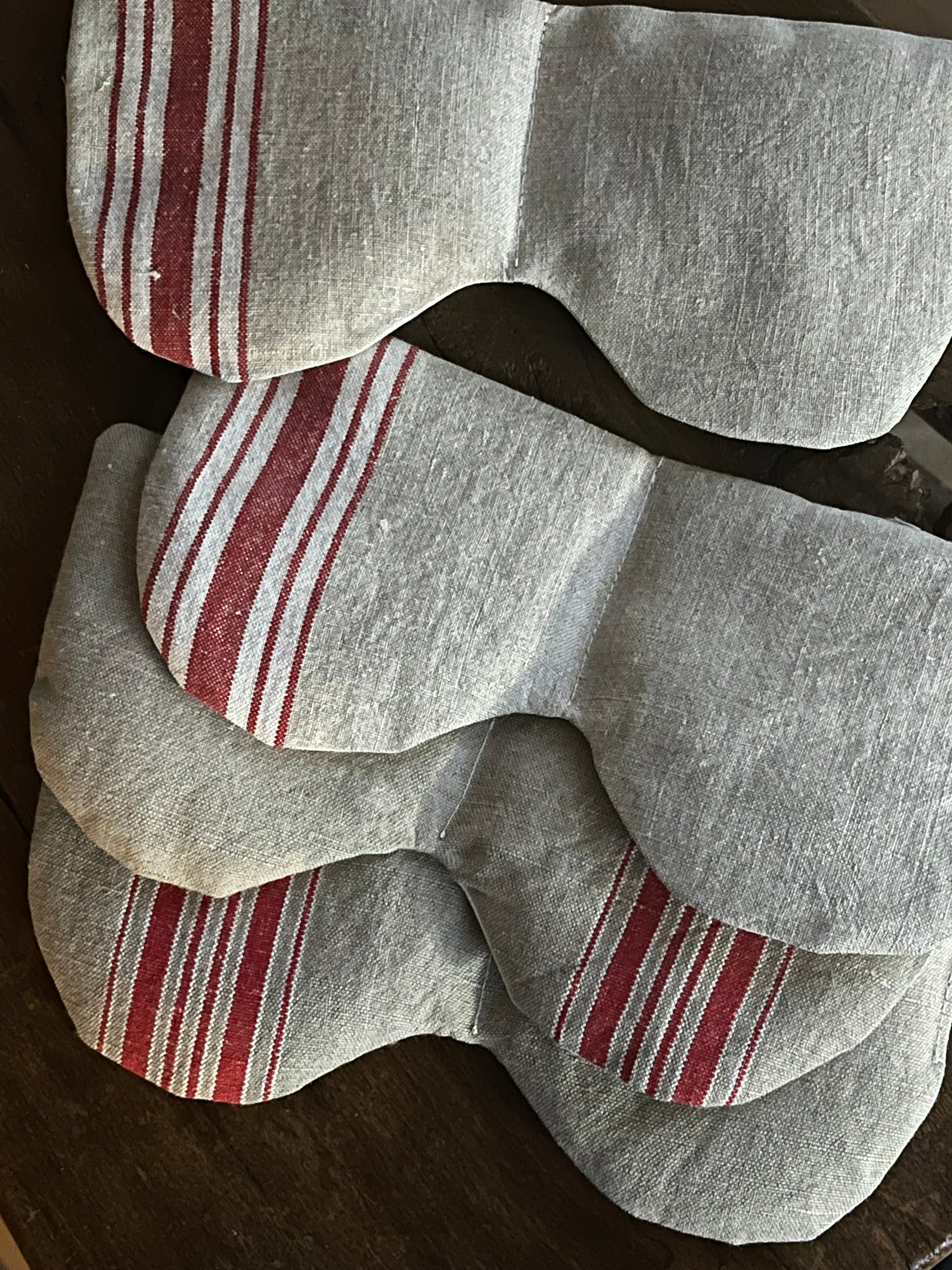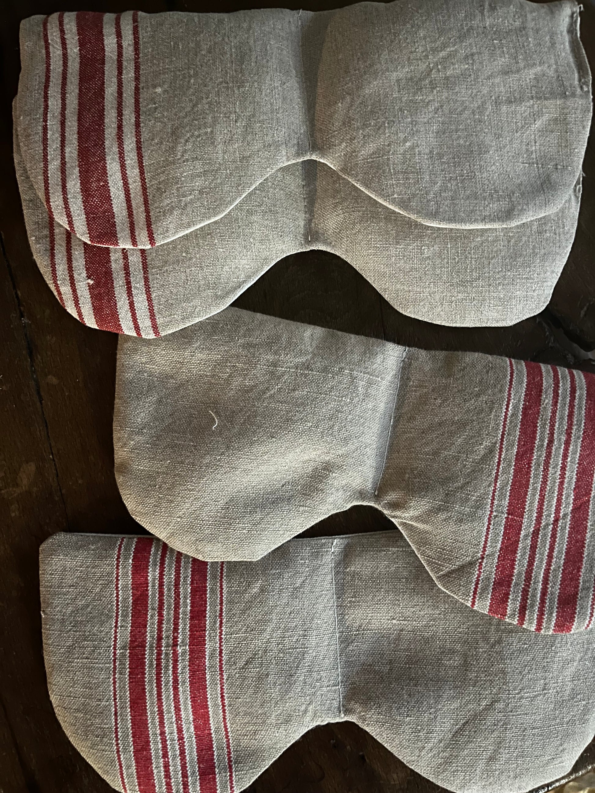 Augenmaske aus vintage Leinen, gefüllt mit Rapssamen oder Leinsamen. Ideal für Yoga oder bei Migräne und müden, geschwollenen Augenpartien. Das Leinen fühlt sich schön kühl und weich auf der Haut an. Antikes Leinen ist frei von Chemie und besonders wohltuend. Einfach die Maske in die Gefriertruhe oder das Kühlfach legen. Bei Bedarf auf die geschlossenen Augen legen und 10 Minuten entspannt zur Ruhe kommen. Bei Kopfschmerzen kann die Kälte entspannend wirken. Die Maske kann dauerhaft in der Gefriertruhe liegen und jedes Mal, wenn sie gebraucht wird, herausgeholt werden. Danach einfach wieder in der Truhe aufbewahren. Raps- und Leinsamen speichern die Kälte wunderbar.