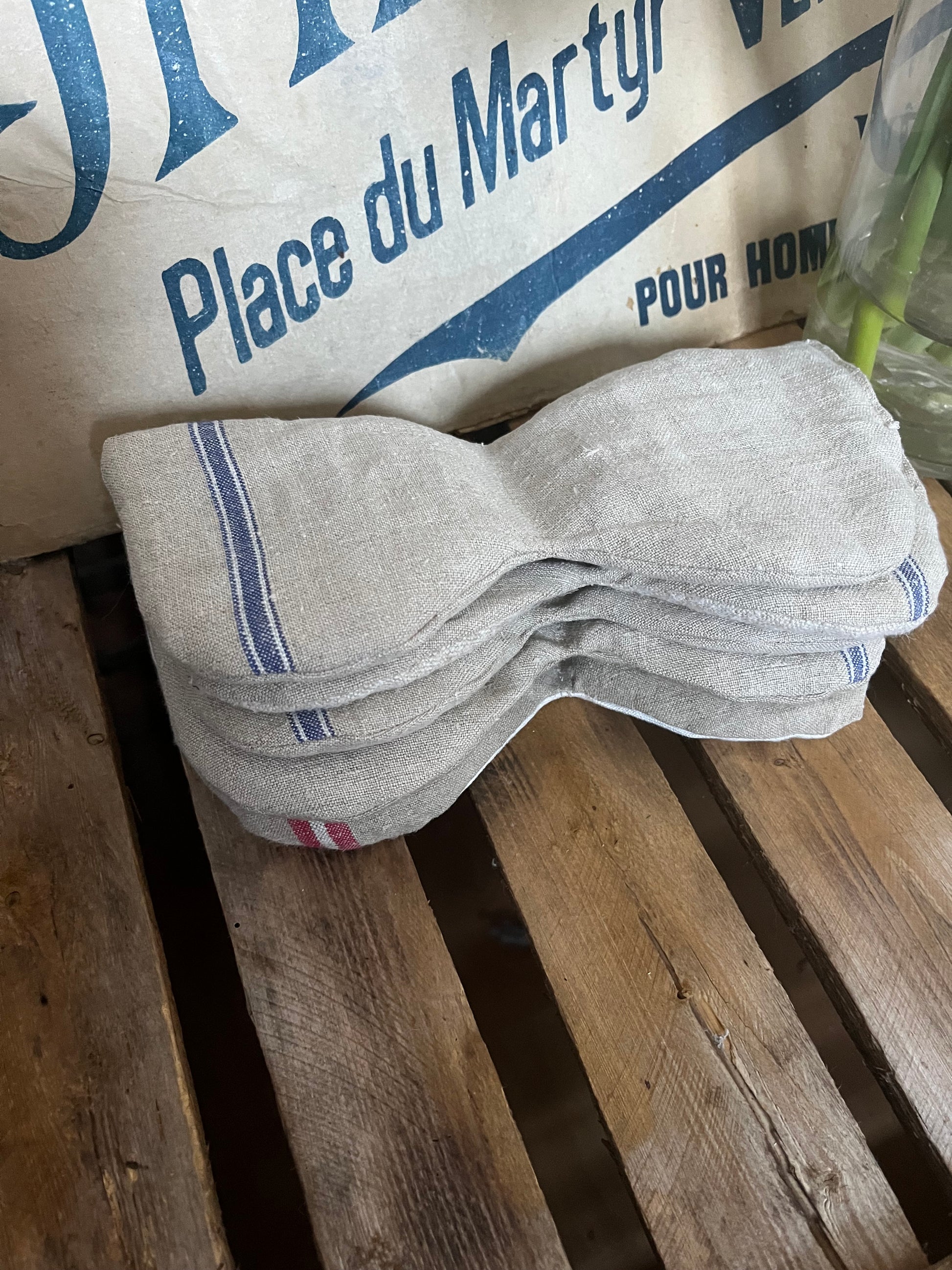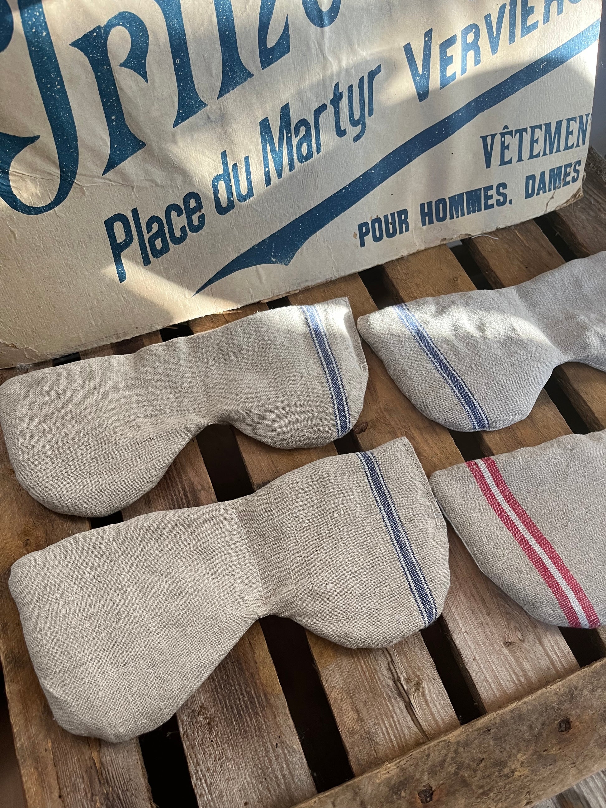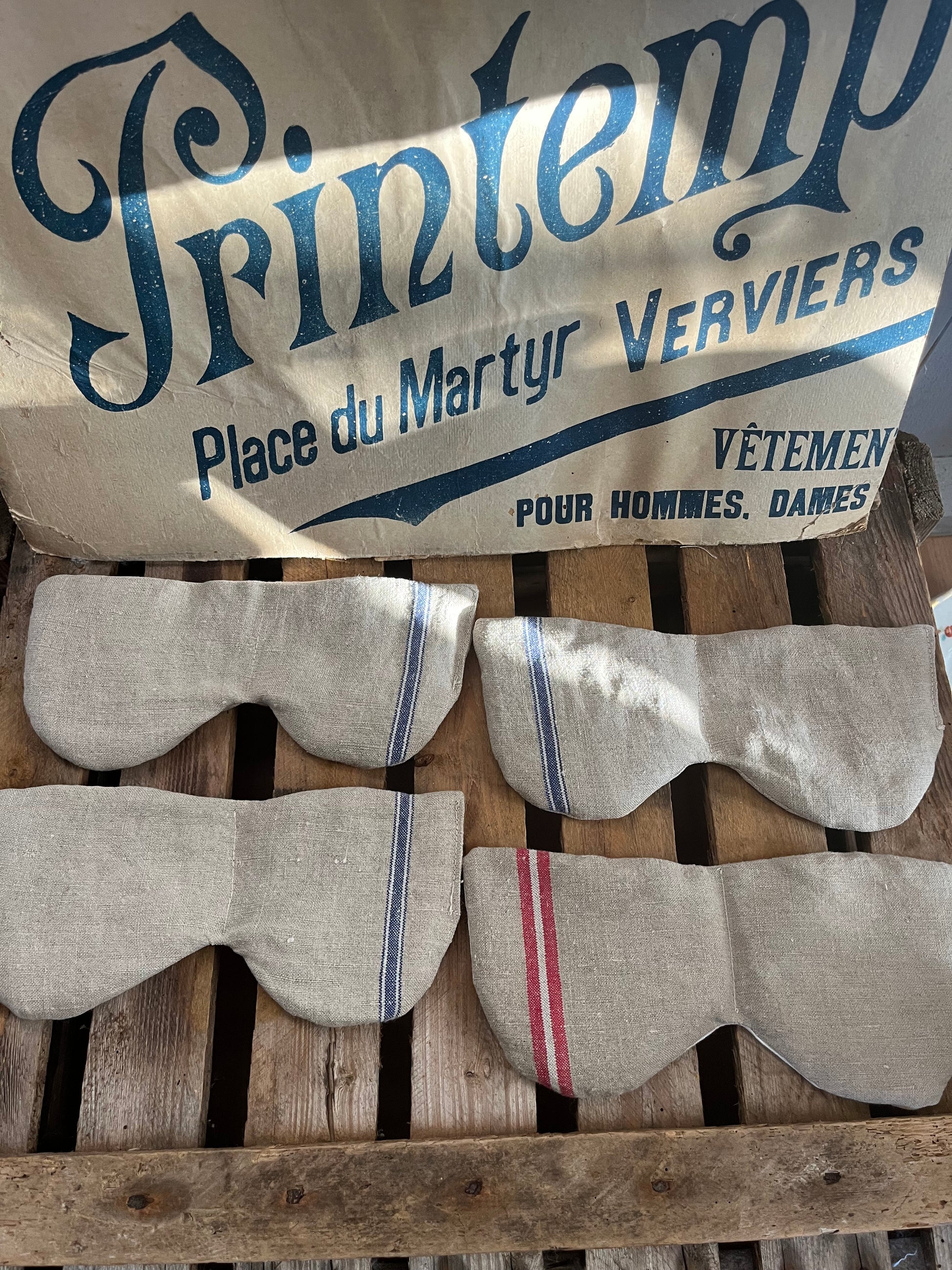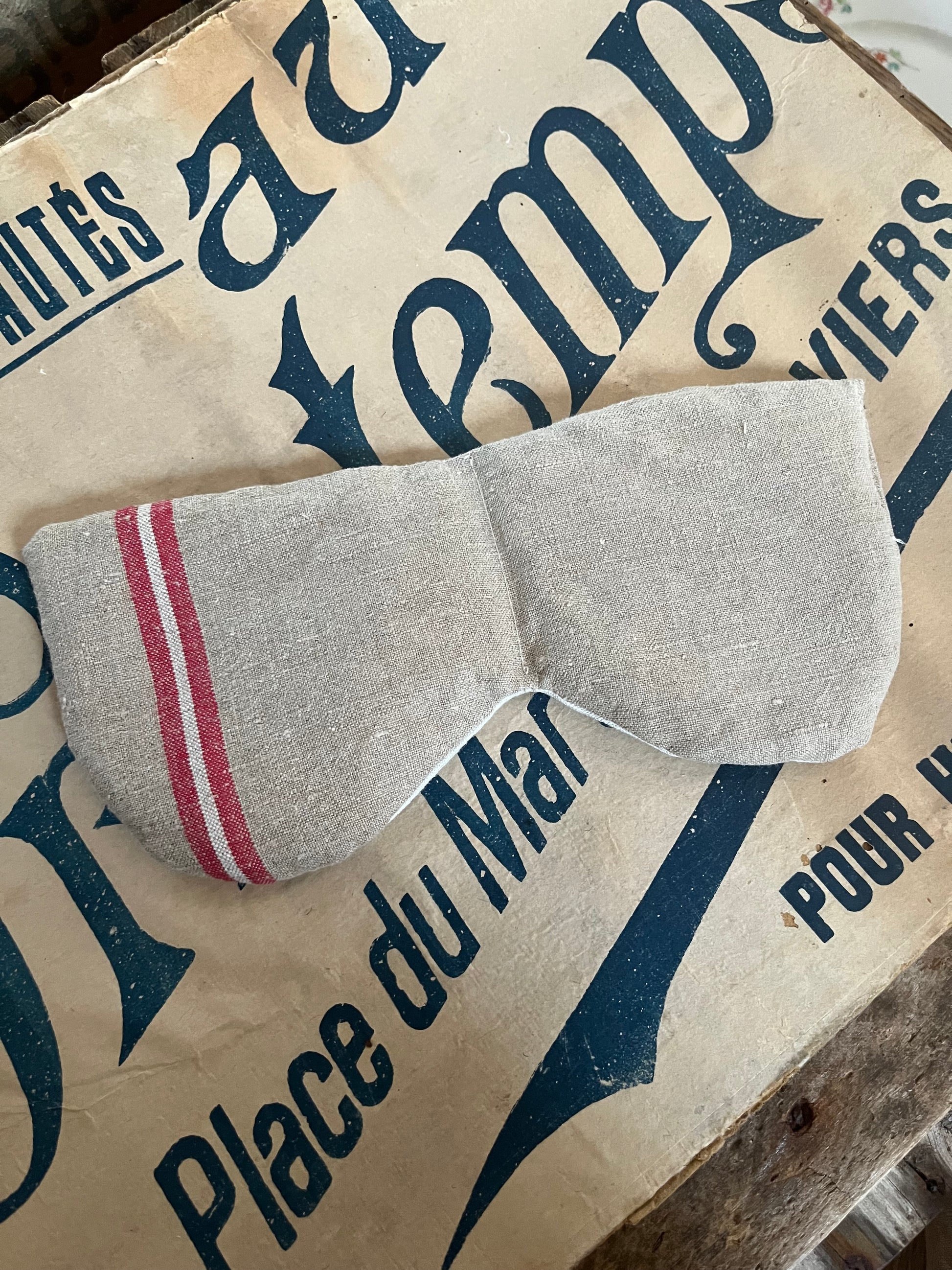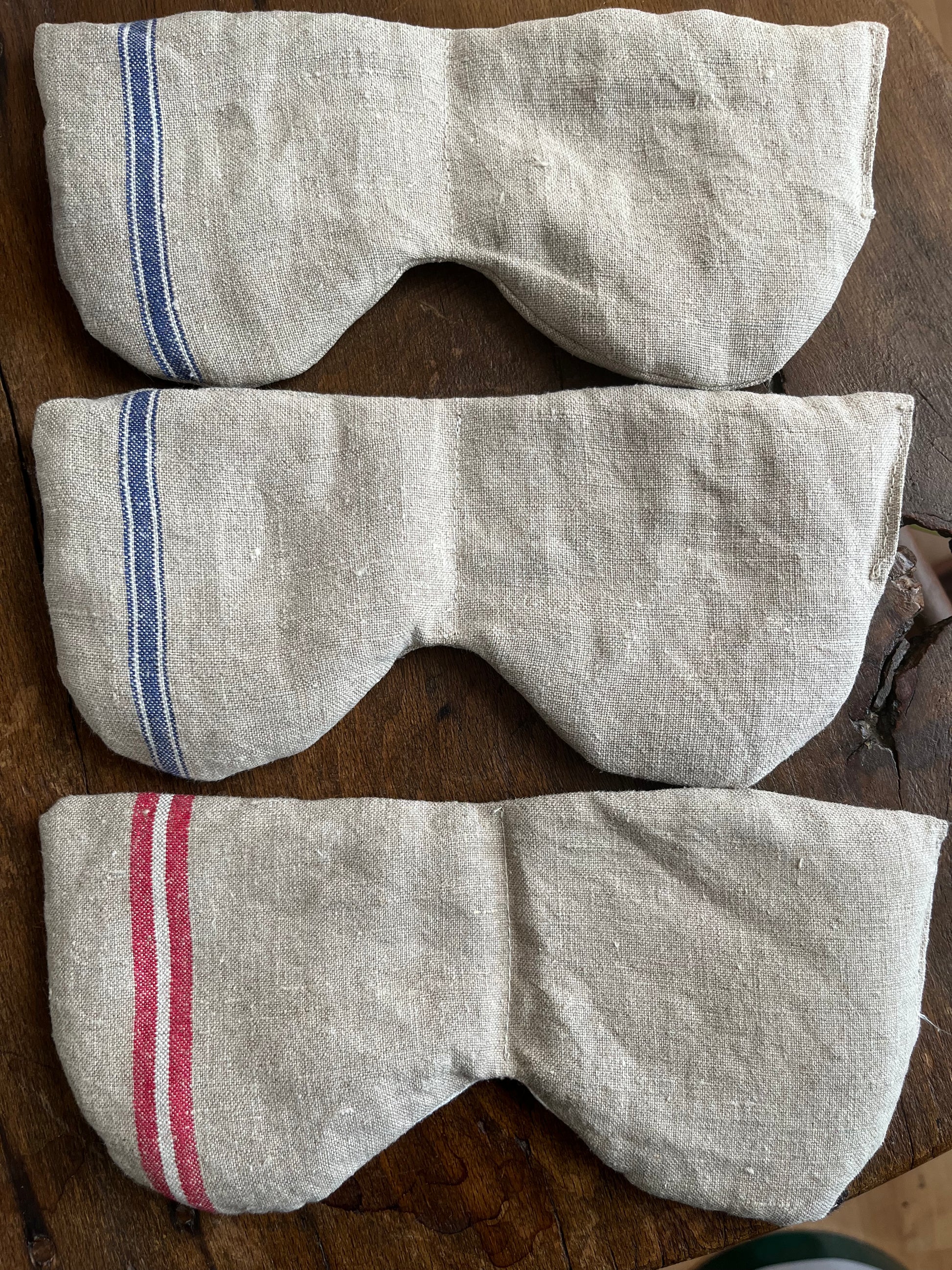 Augenmaske aus vintage Leinen, zart blau oder rot gestreift, gefüllt mit Rapssamen oder Leinsamen. Ideal für Yoga oder bei Migräne und müden, geschwollenen Augenpartien. Das Leinen fühlt sich schön kühl und weich auf der Haut an. Die Streifen sind immer ein bisschen anders. Antikes Leinen ist frei von Chemie und besonders wohltuend. Einfach die Maske in die Gefriertruhe oder das Kühlfach legen. Bei Bedarf auf die geschlossenen Augen legen und 10 Minuten entspannt zur Ruhe kommen. Bei Kopfschmerzen kann die Kälte entspannend wirken. Die Maske kann dauerhaft in der Gefriertruhe liegen und jedes Mal, wenn sie gebraucht wird, herausgeholt werden. Danach einfach wieder in der Truhe aufbewahren. Raps- und Leinsamen speichern die Kälte wunderbar.