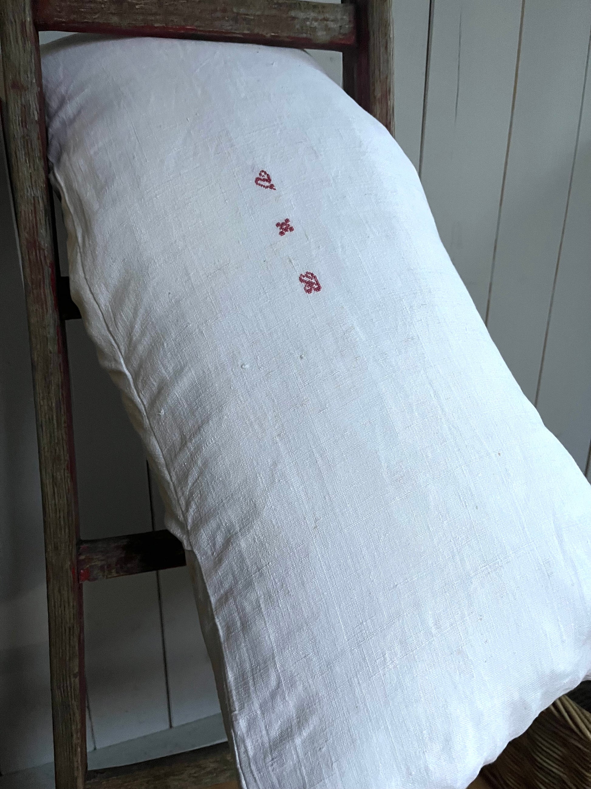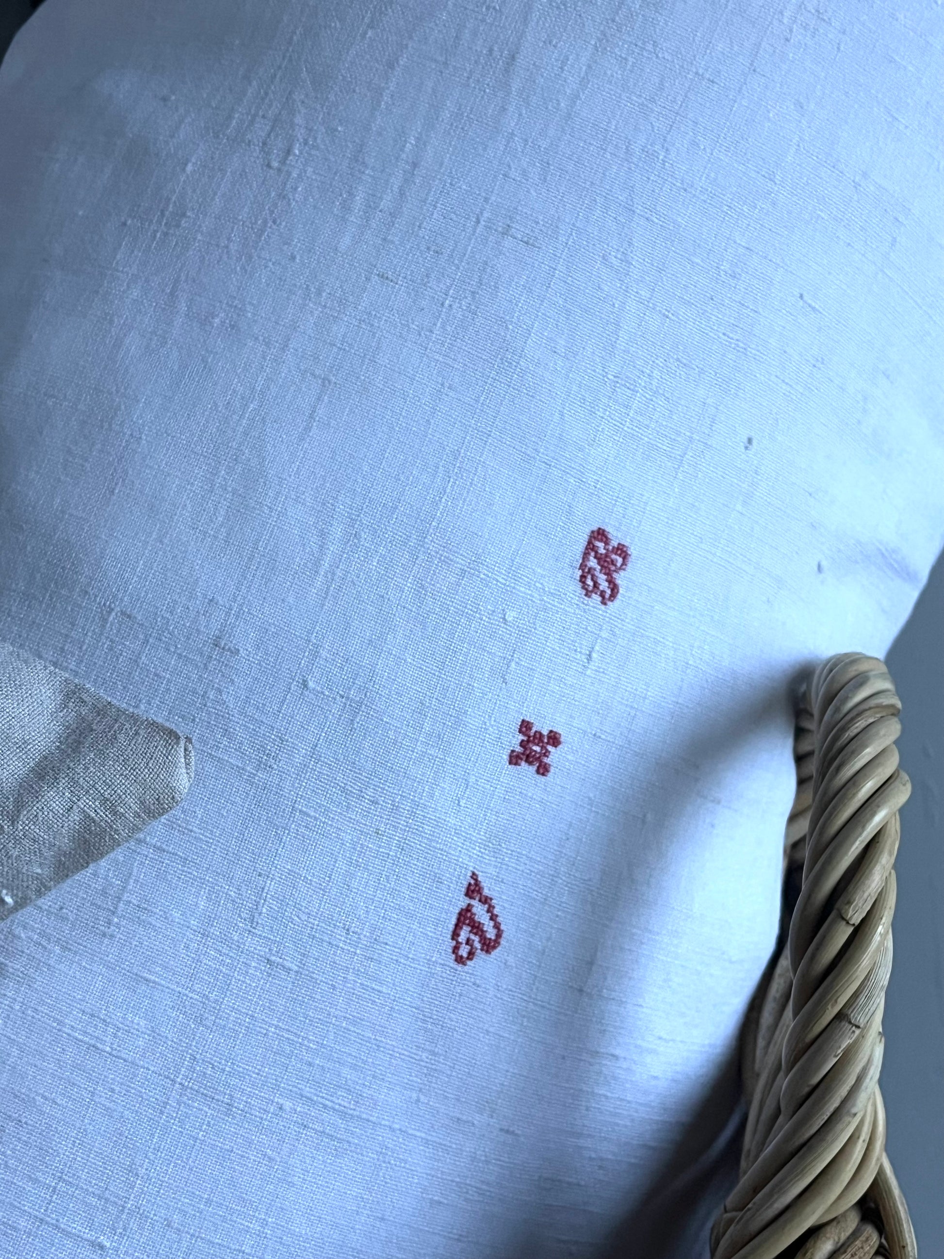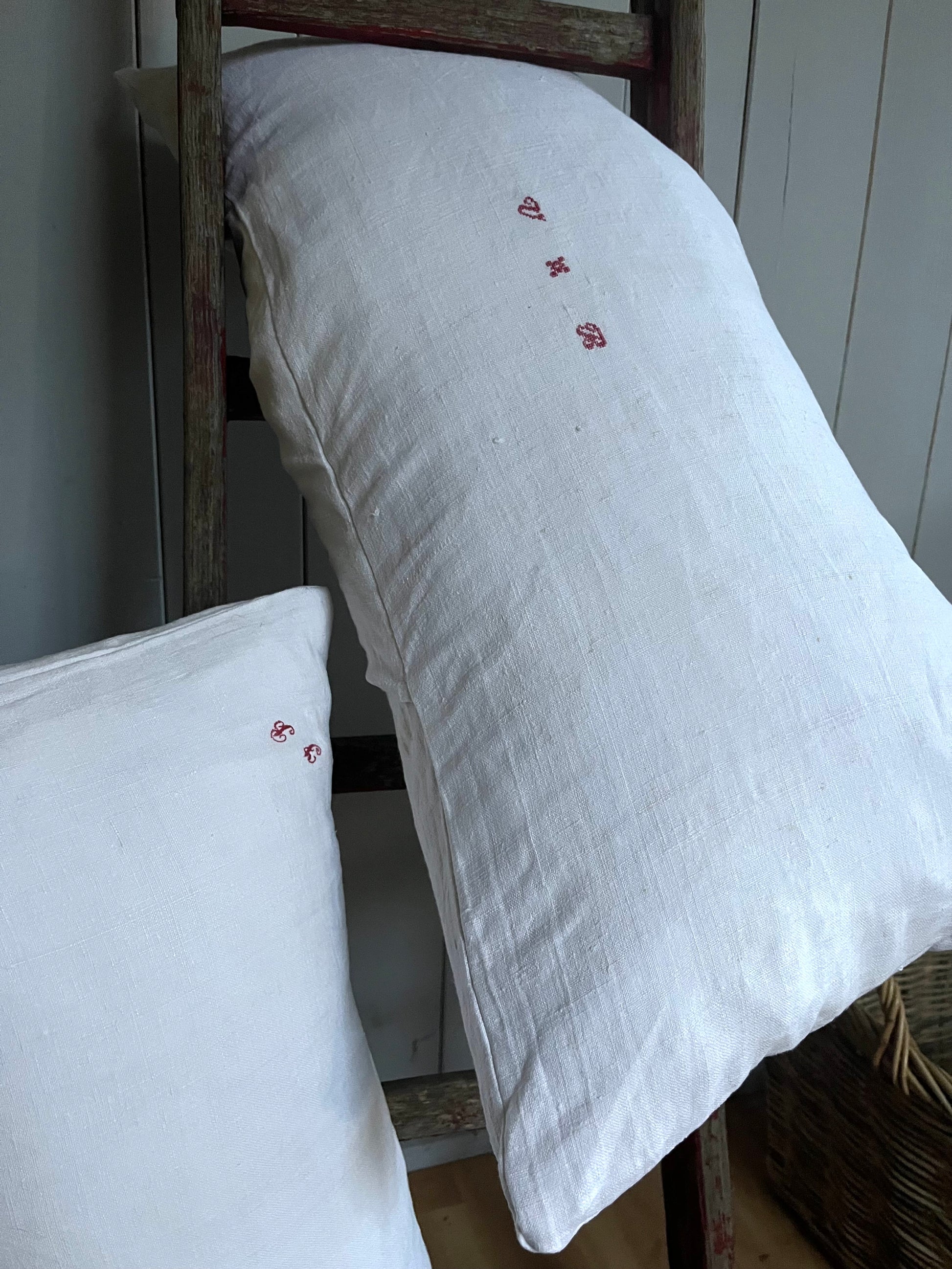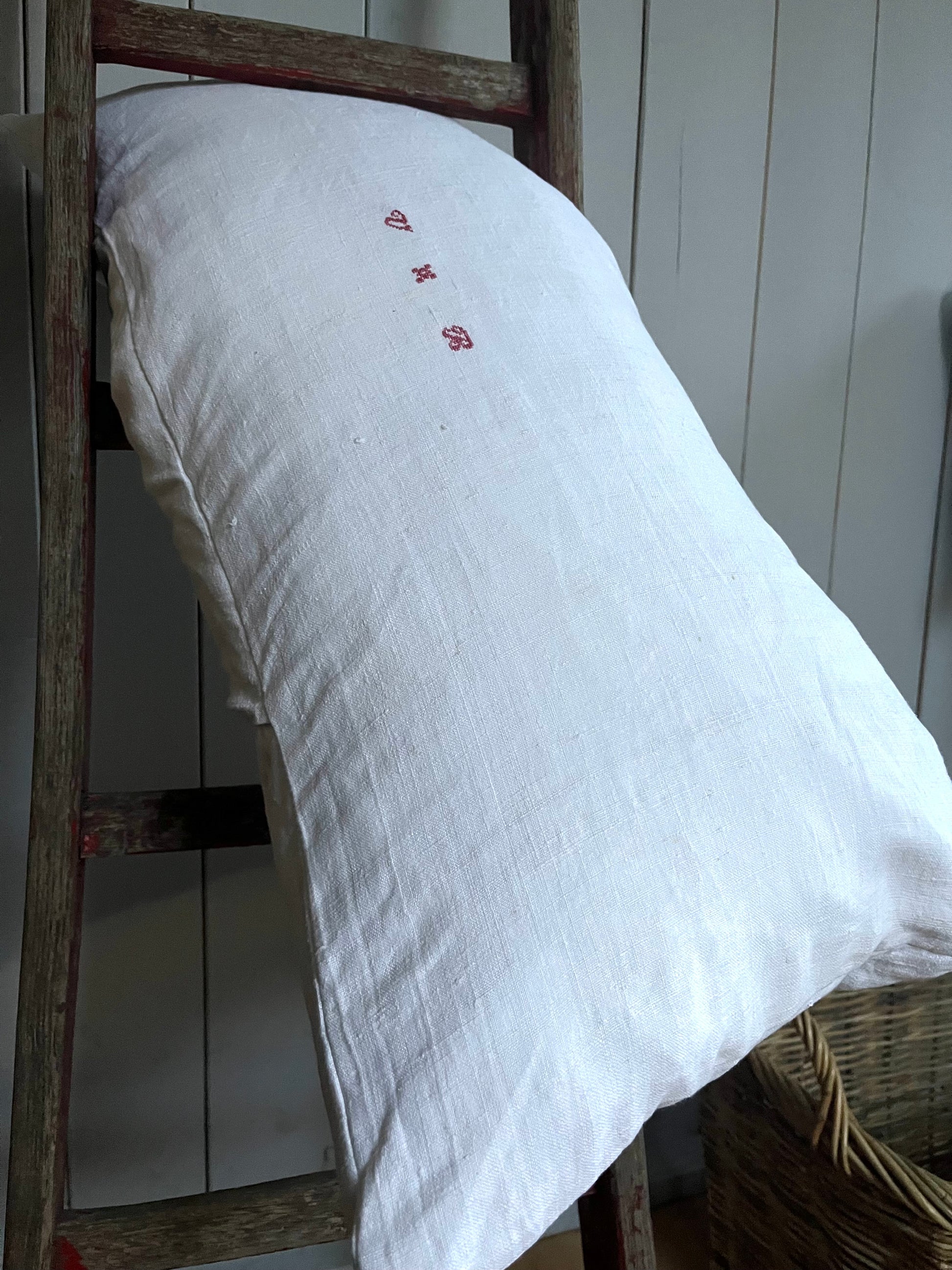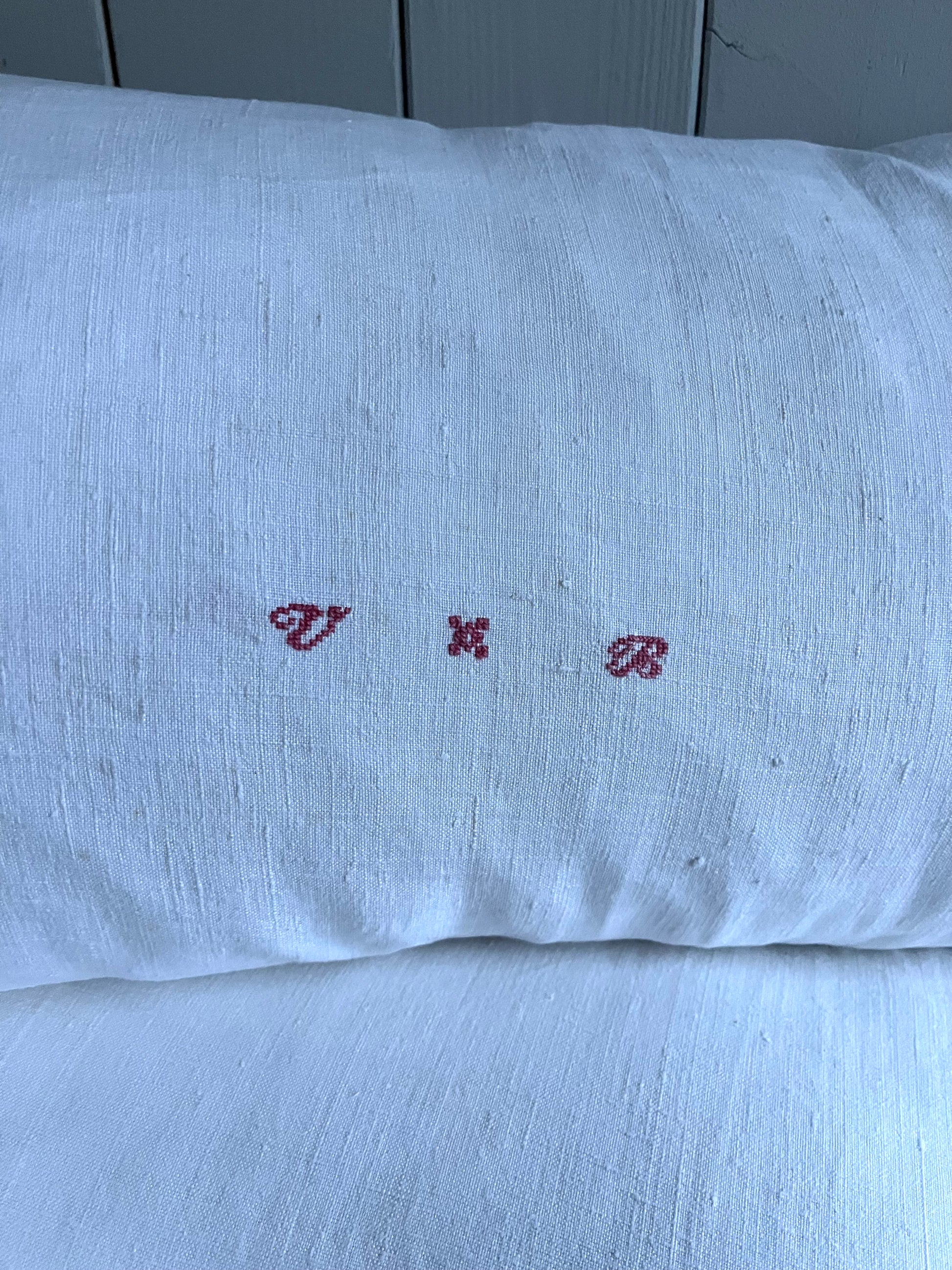 Nur Bauernleinen in Weiß, sonst gar nichts! Dieser Kissenbezug wurde aus einer handgewebten Decke genäht - von circa 1900. Wunderschönes, dicht gewebtes Leinen. Schönes Monogramm mittig. Für Sofa, das Bett, die Bank… Maße: circa 75 × 40, es passt eine 80 × 40 cm Füllung hinein. Das Kissen kommt ohne Füllung. Hotelverschluss auf der Rückseite.