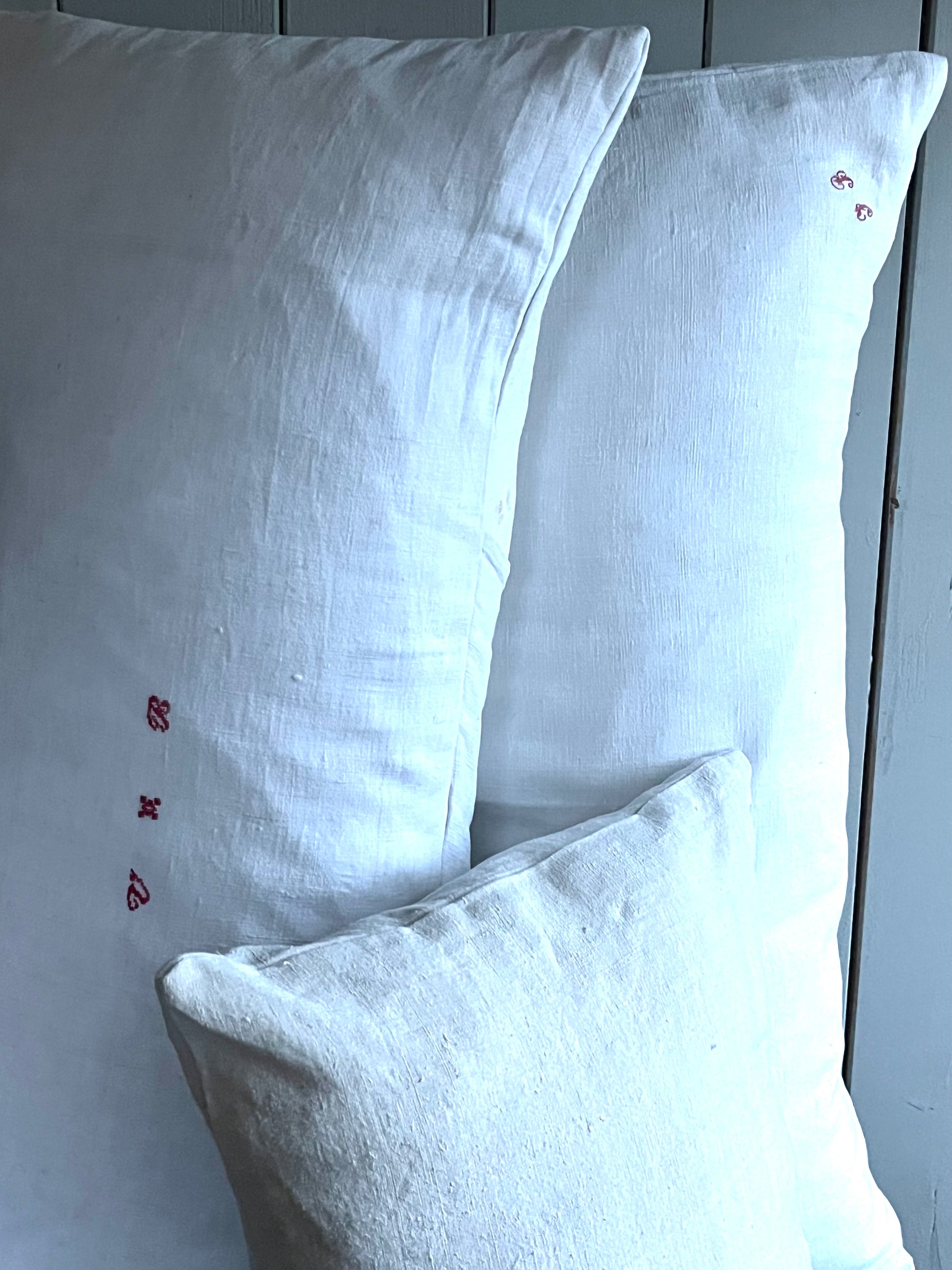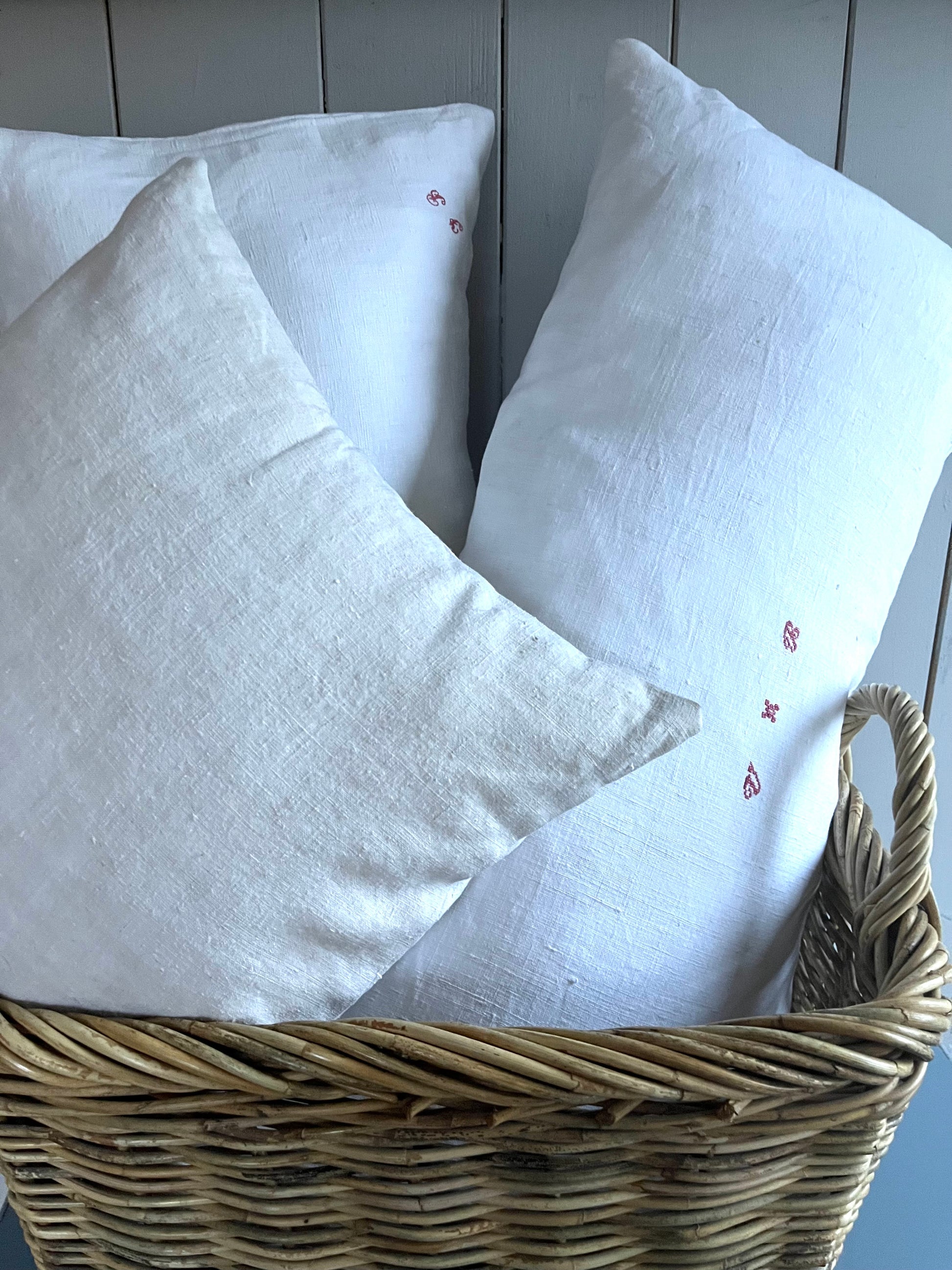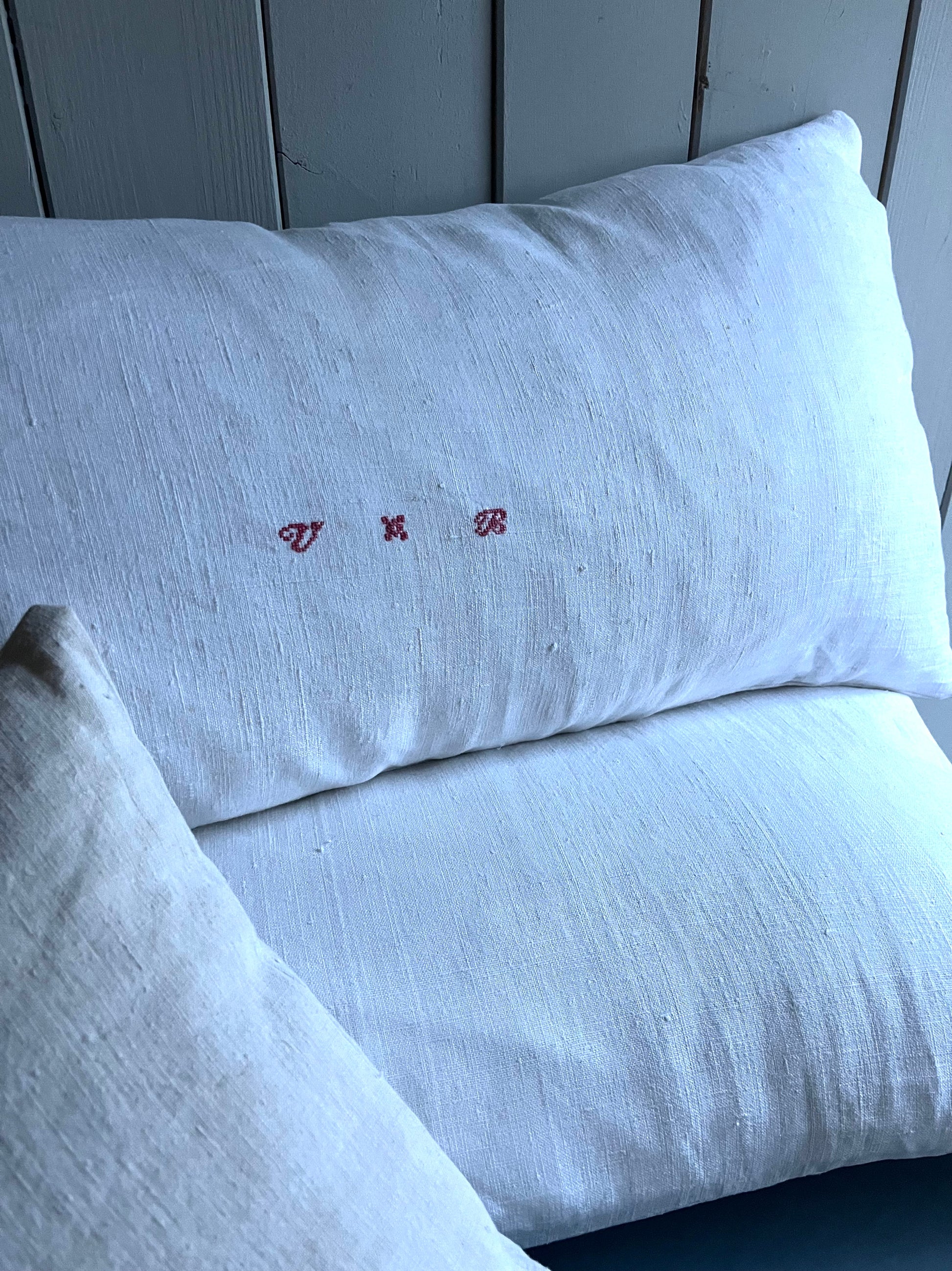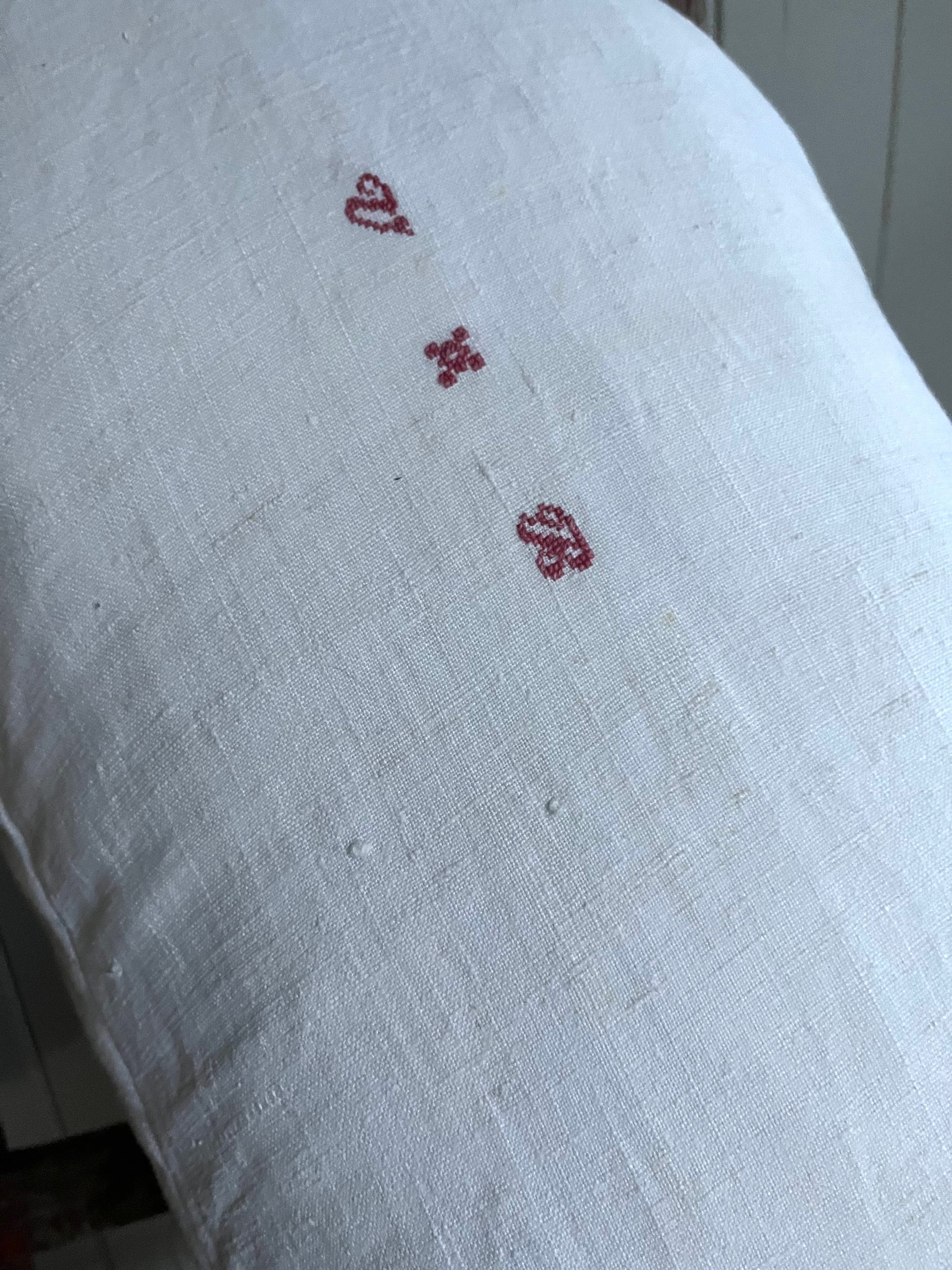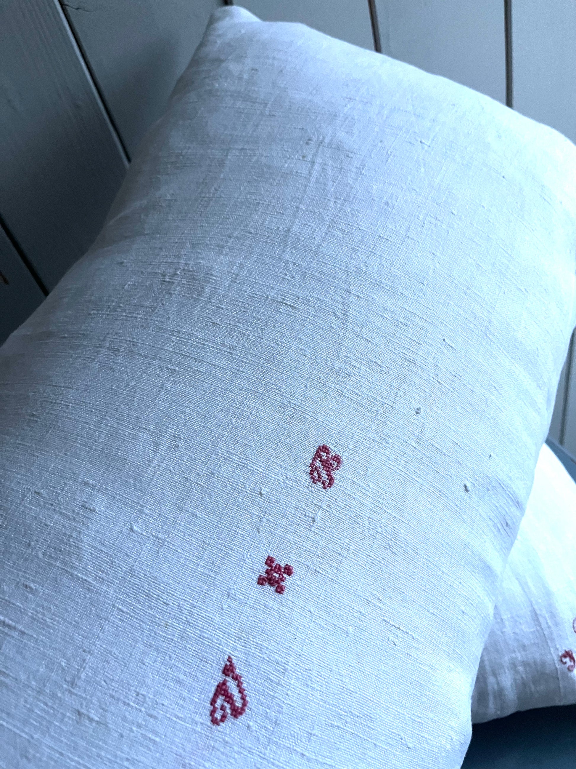 Nur Bauernleinen in Weiß, sonst gar nichts! Dieser Kissenbezug wurde aus einer handgewebten Decke genäht - von circa 1900. Wunderschönes, dicht gewebtes Leinen. Schönes Monogramm mittig. Für Sofa, das Bett, die Bank… Maße: circa 75 × 40, es passt eine 80 × 40 cm Füllung hinein. Das Kissen kommt ohne Füllung. Hotelverschluss auf der Rückseite.