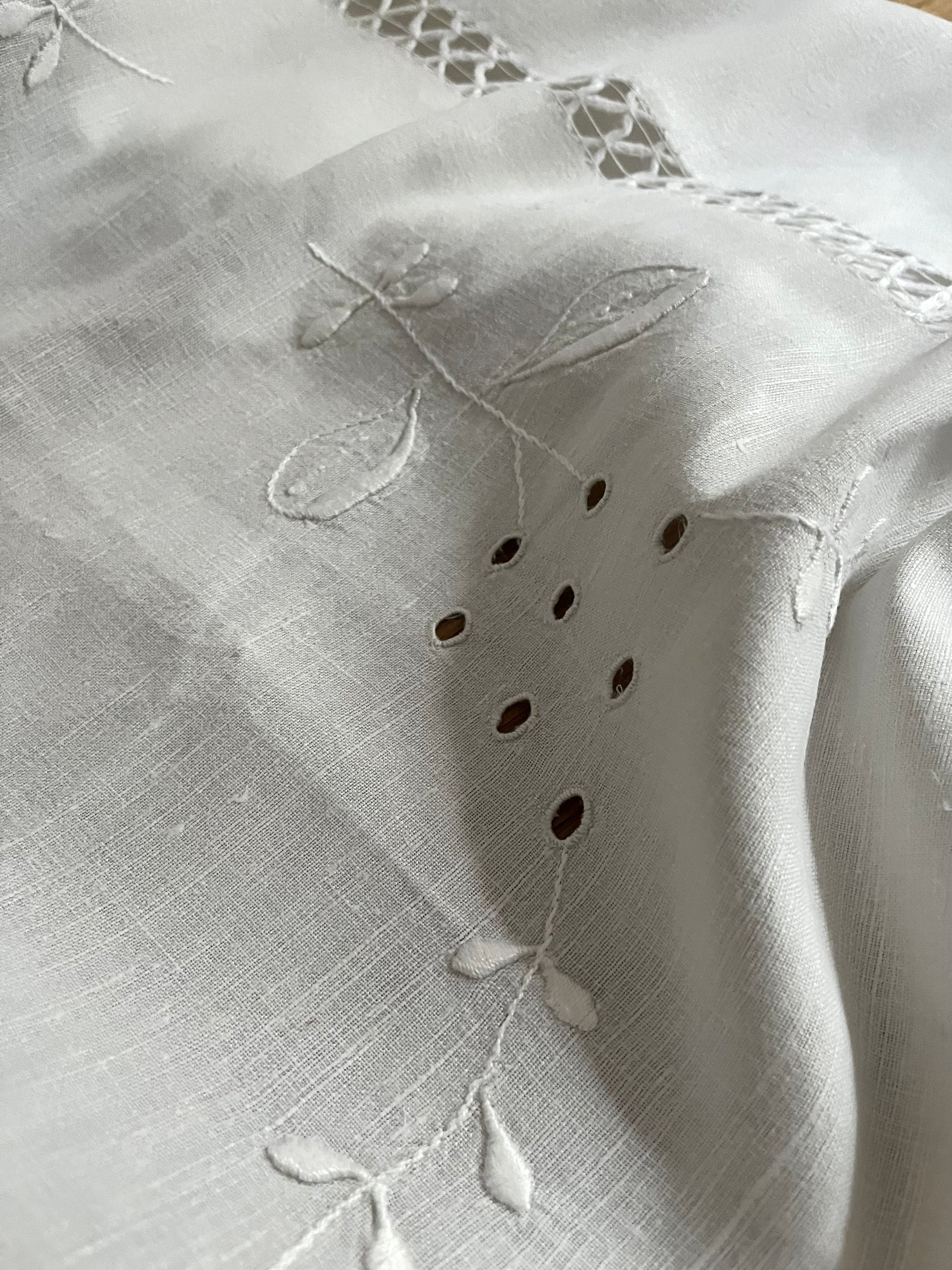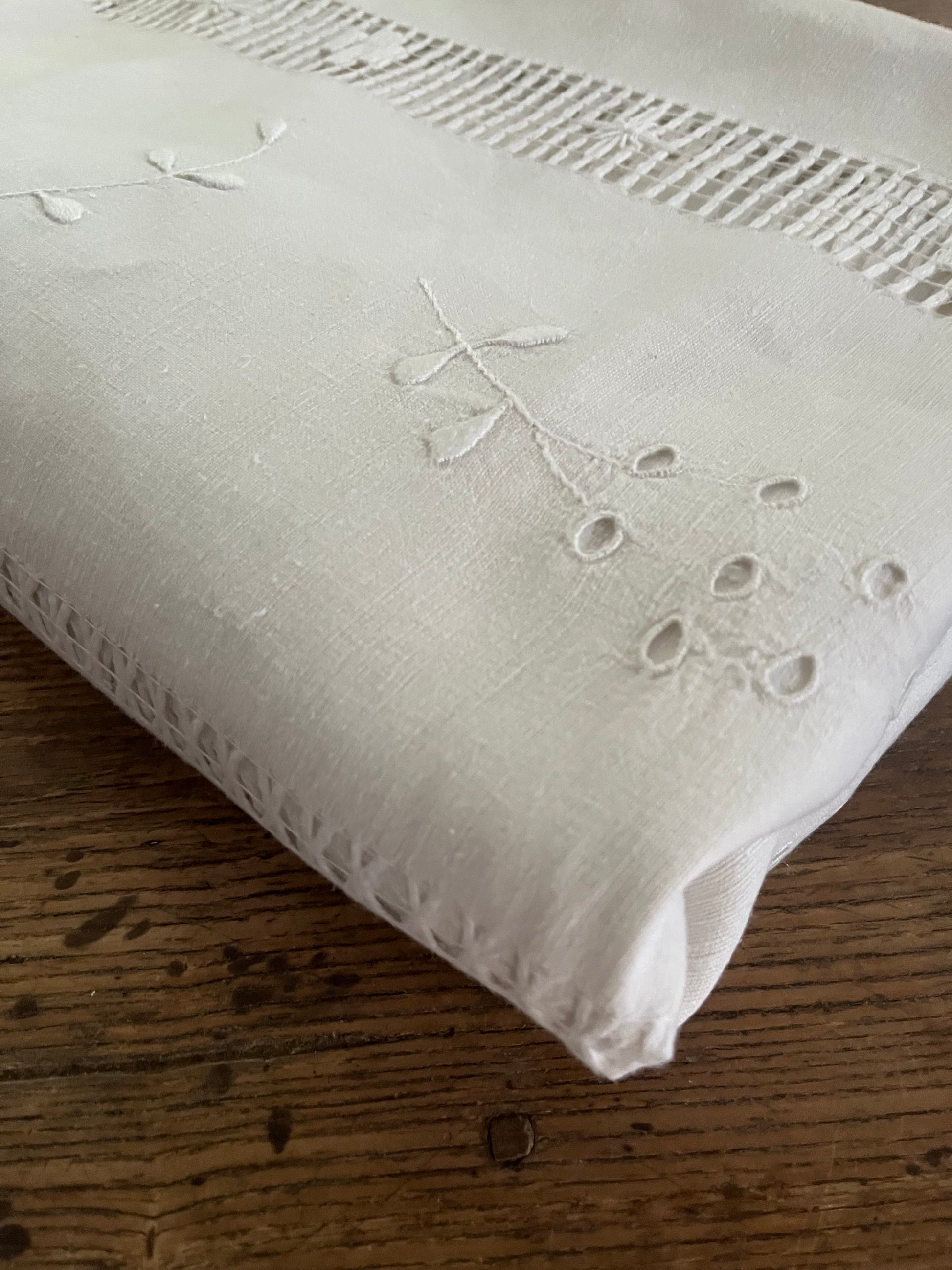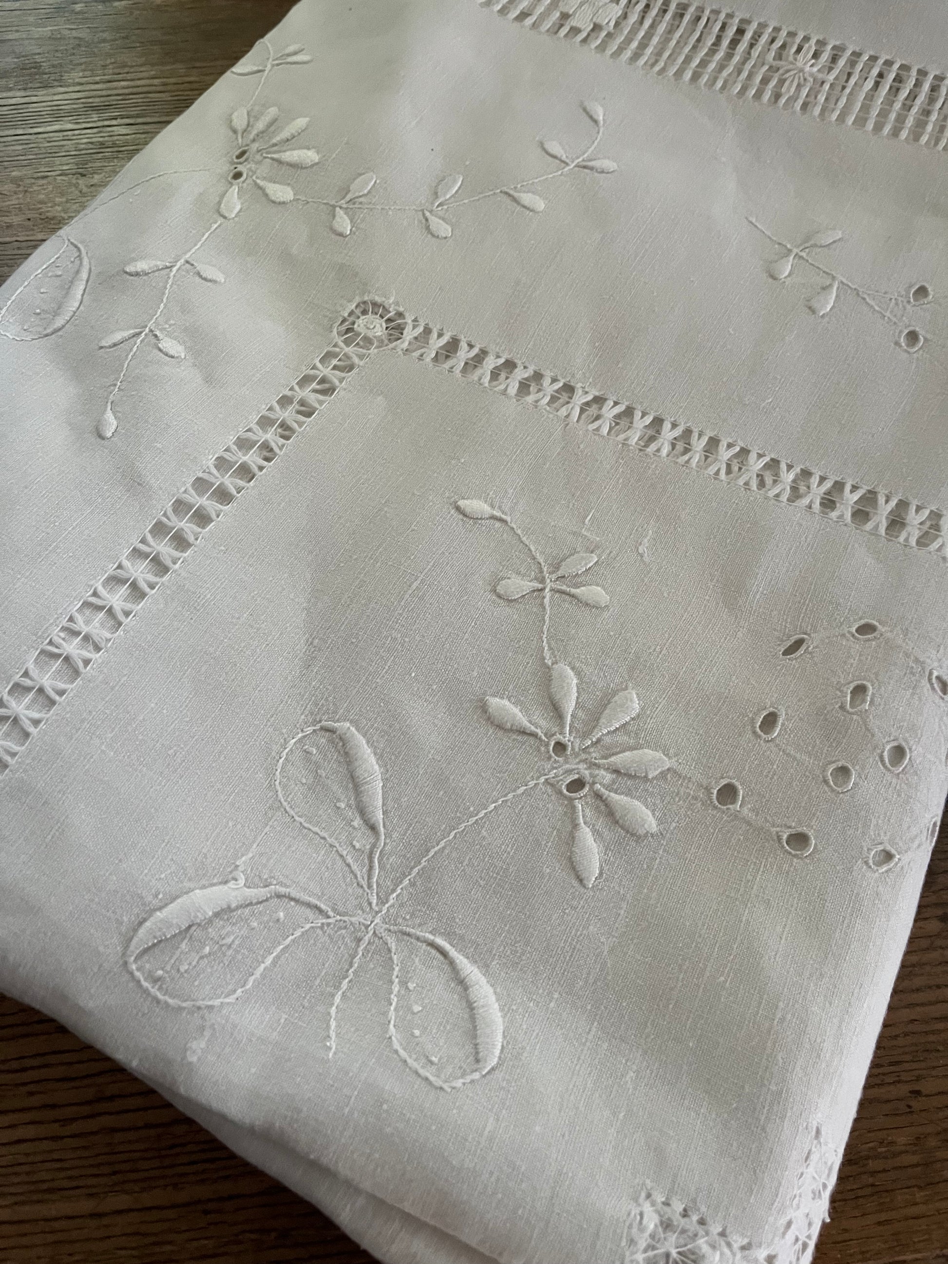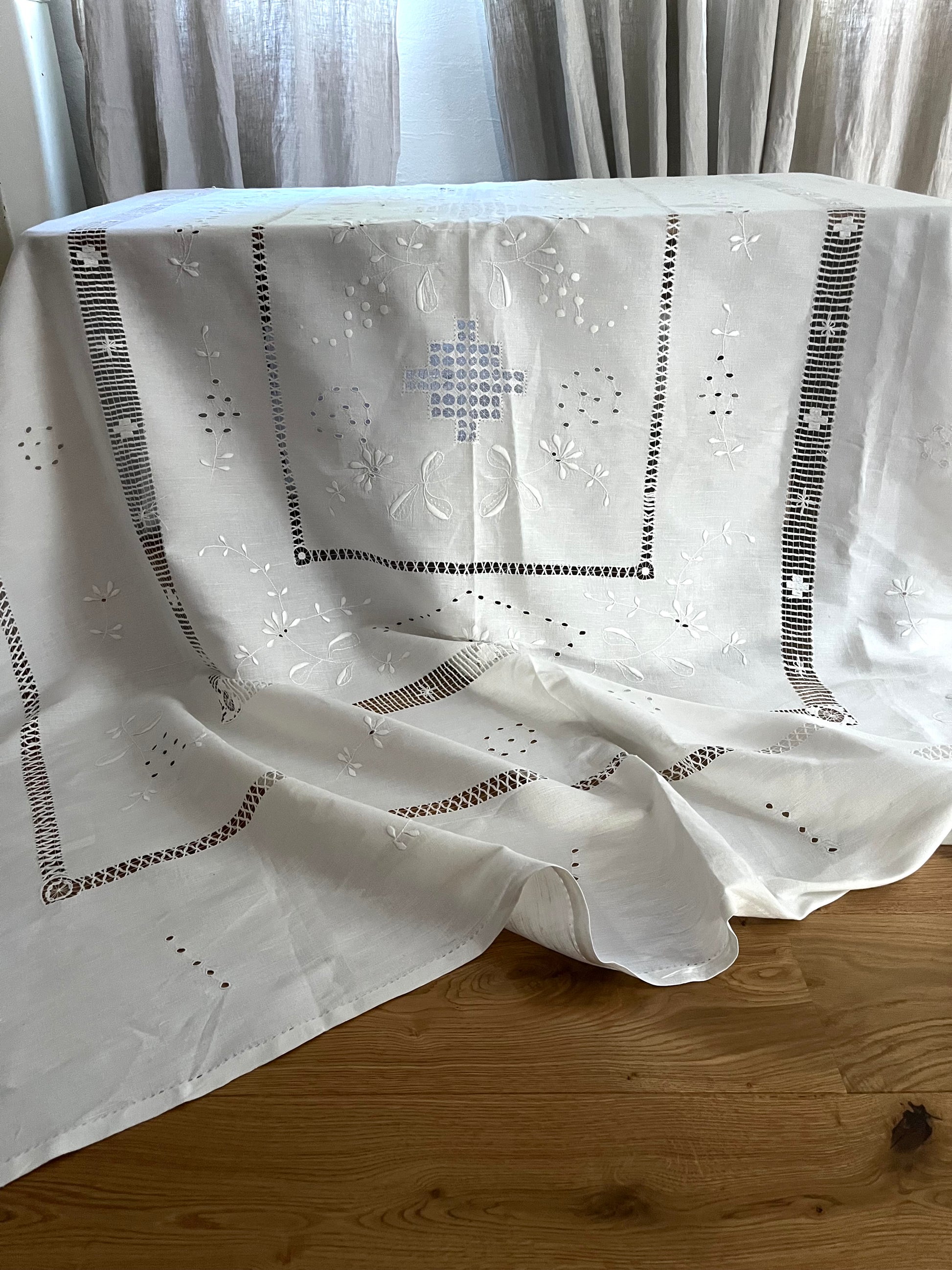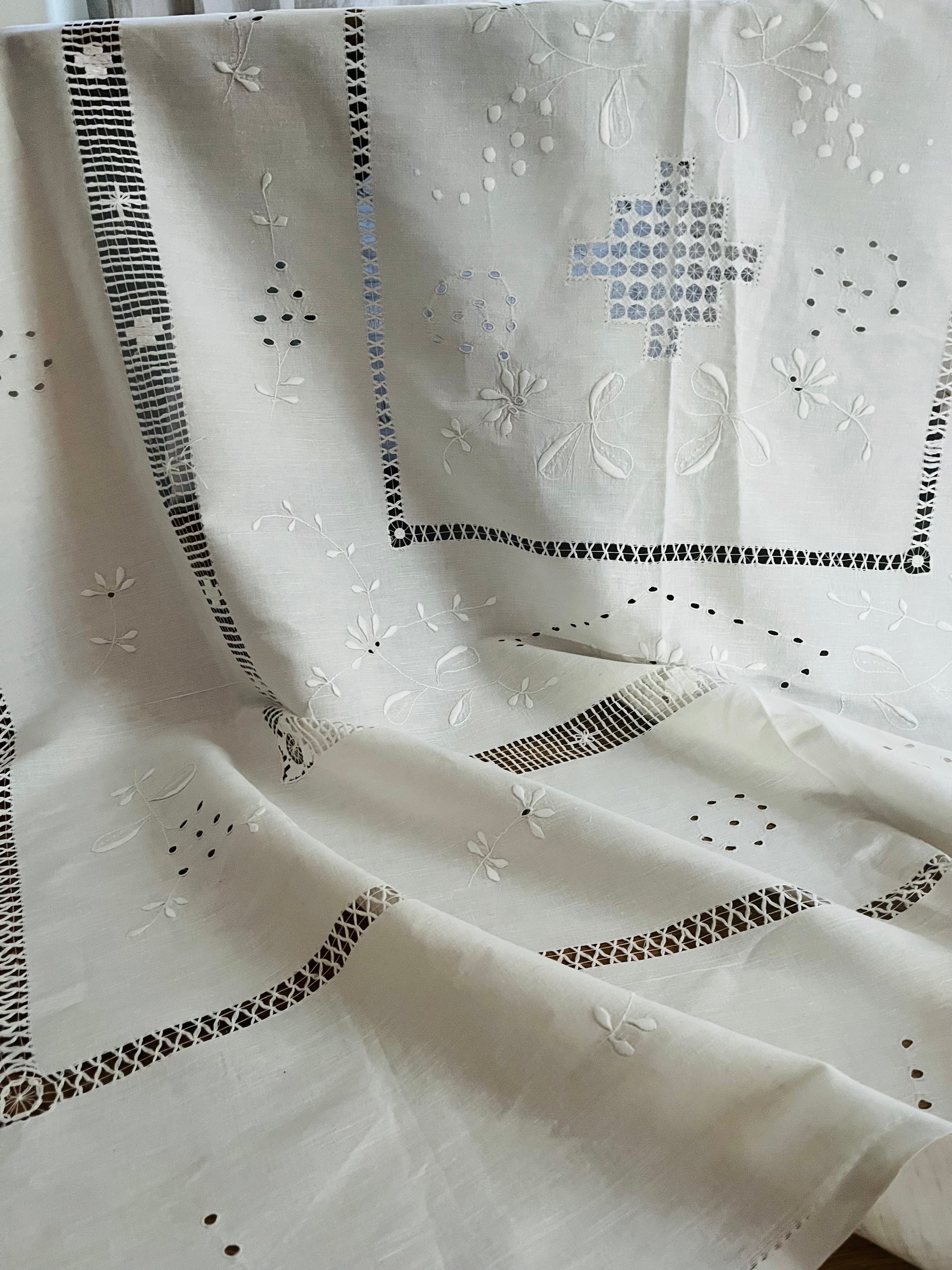 Rarität aus Frankreich: eine besonders große und ehrwürdige Tischdecke mit viel, viel Handarbeit. Sie stammt von einem Gutshof, ist wunderbar erhalten. Es ist Leinen in Weiß. Die Decke wurde üppig bestickt, hat Richelieu- und Hohlsaumarbeiten. Dazu die extra großen Maße: 285 × 210 cm. Ein Prachtstück.