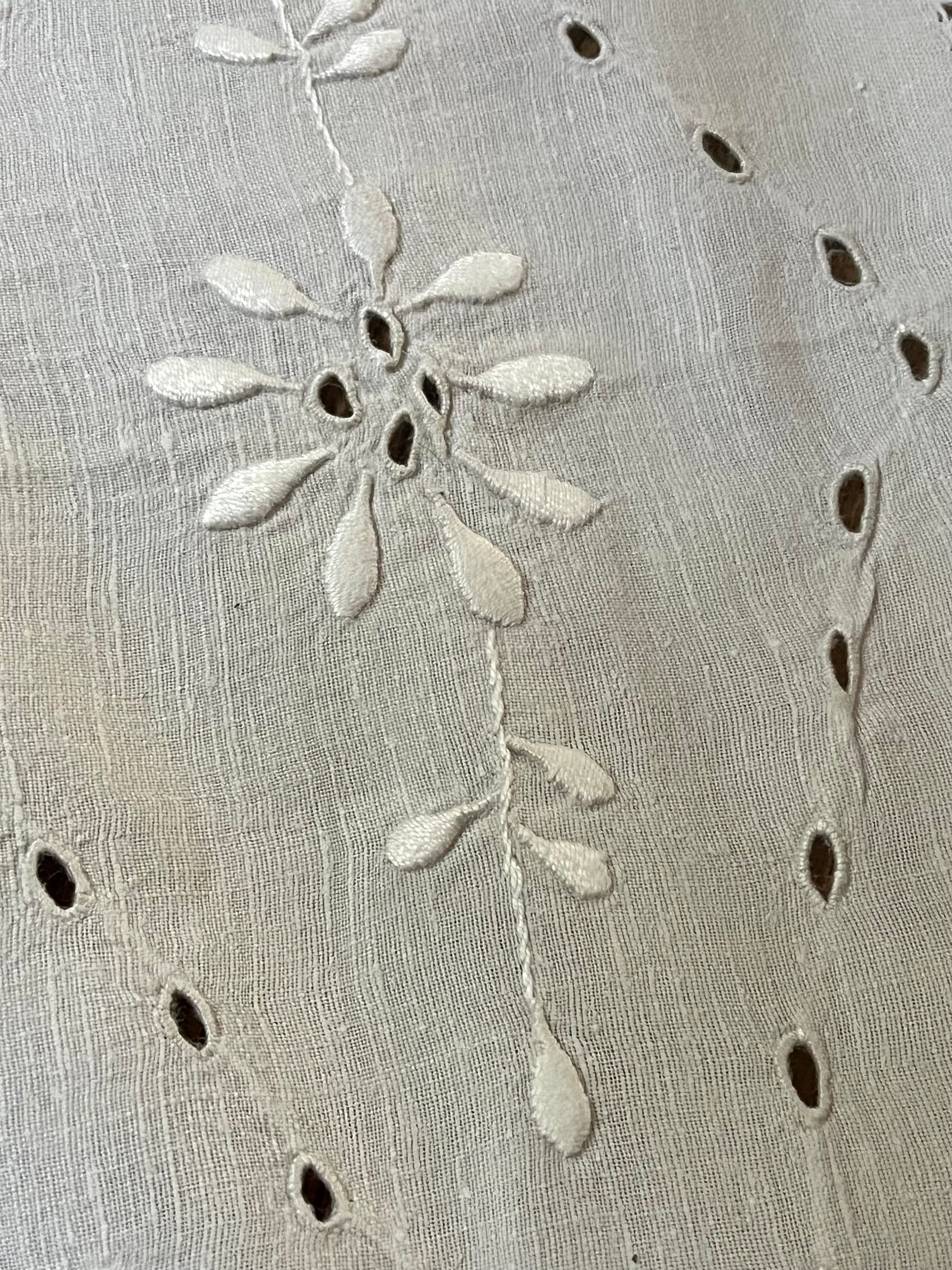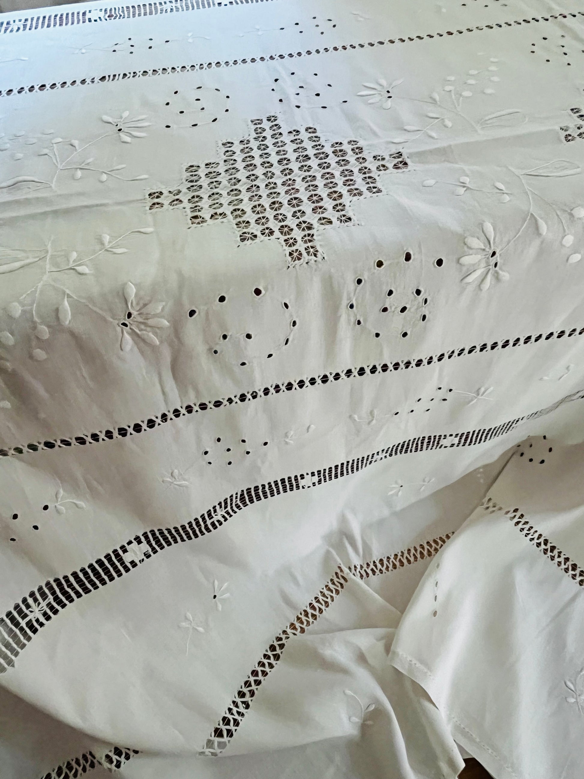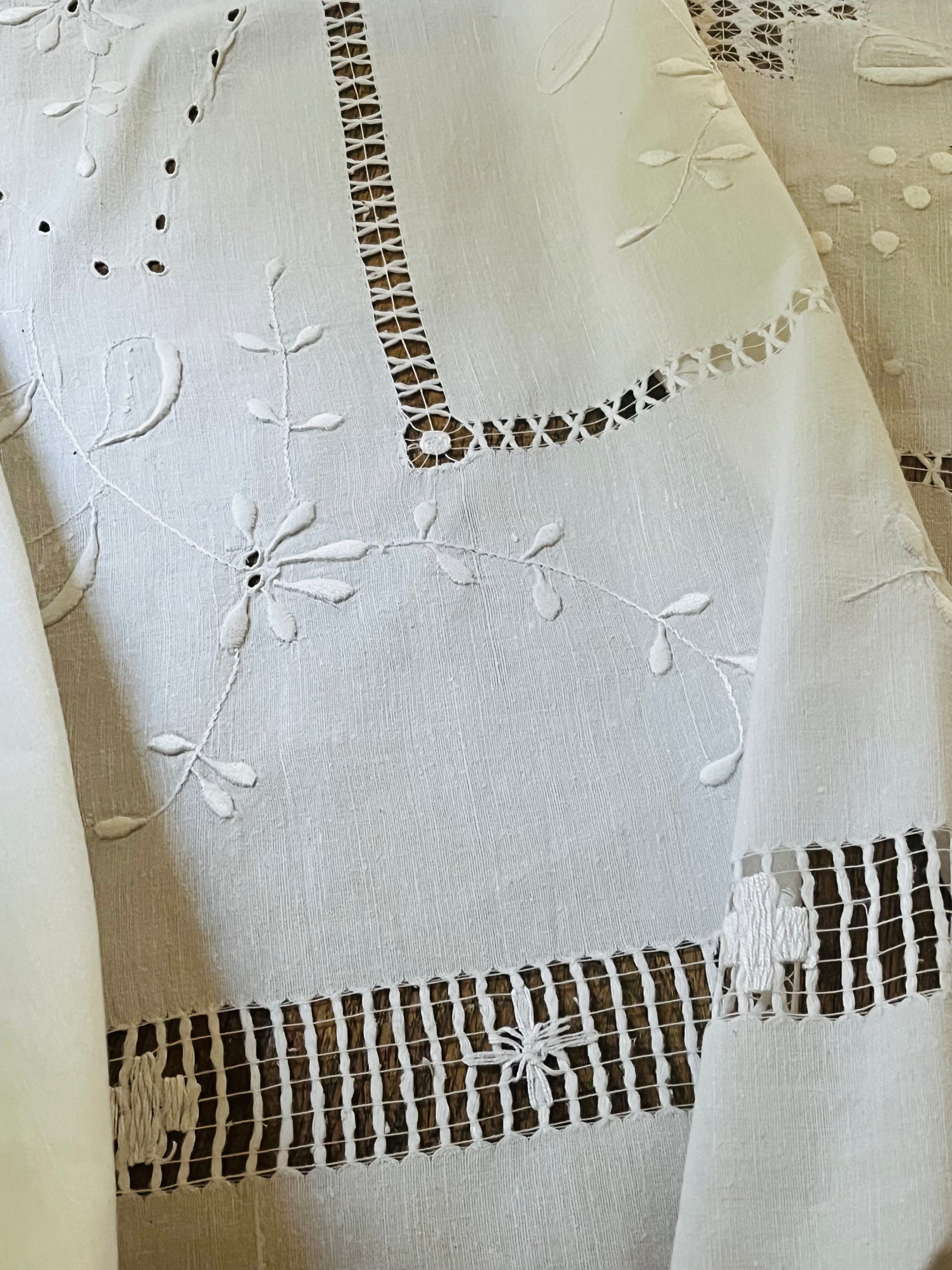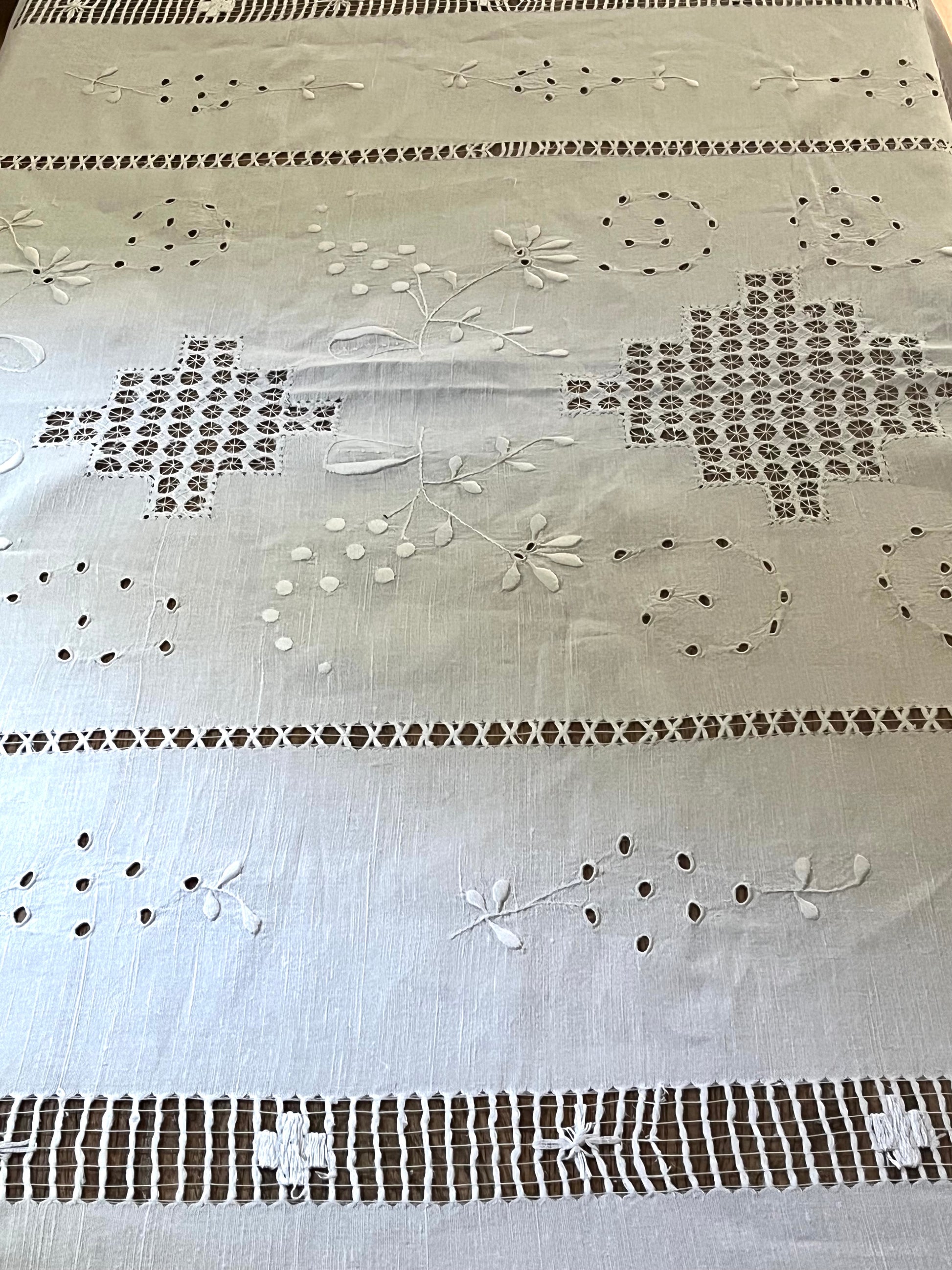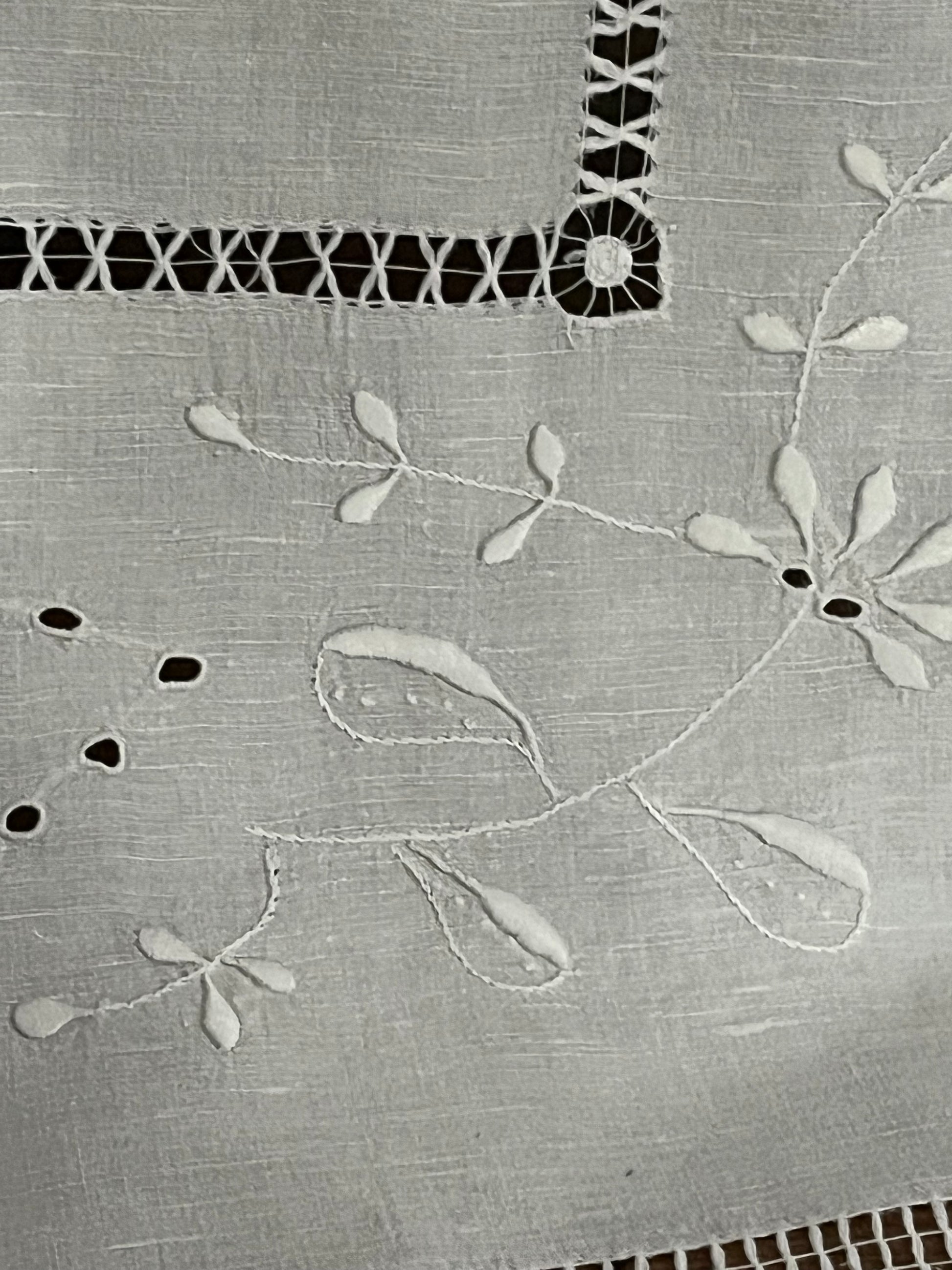 Rarität aus Frankreich: eine besonders große und ehrwürdige Tischdecke mit viel, viel Handarbeit. Sie stammt von einem Gutshof, ist wunderbar erhalten. Es ist Leinen in Weiß. Die Decke wurde üppig bestickt, hat Richelieu- und Hohlsaumarbeiten. Dazu die extra großen Maße: 285 × 210 cm. Ein Prachtstück.