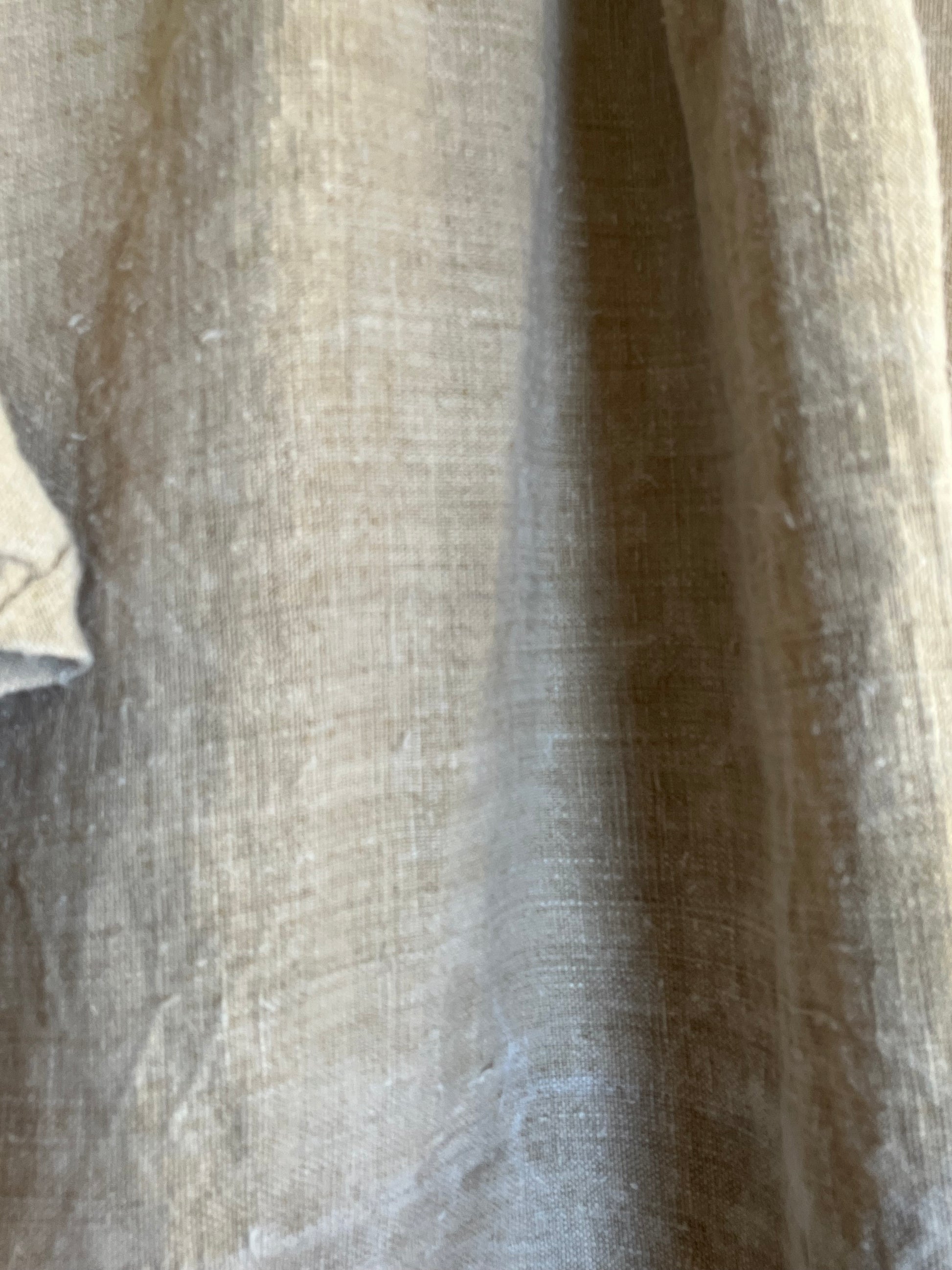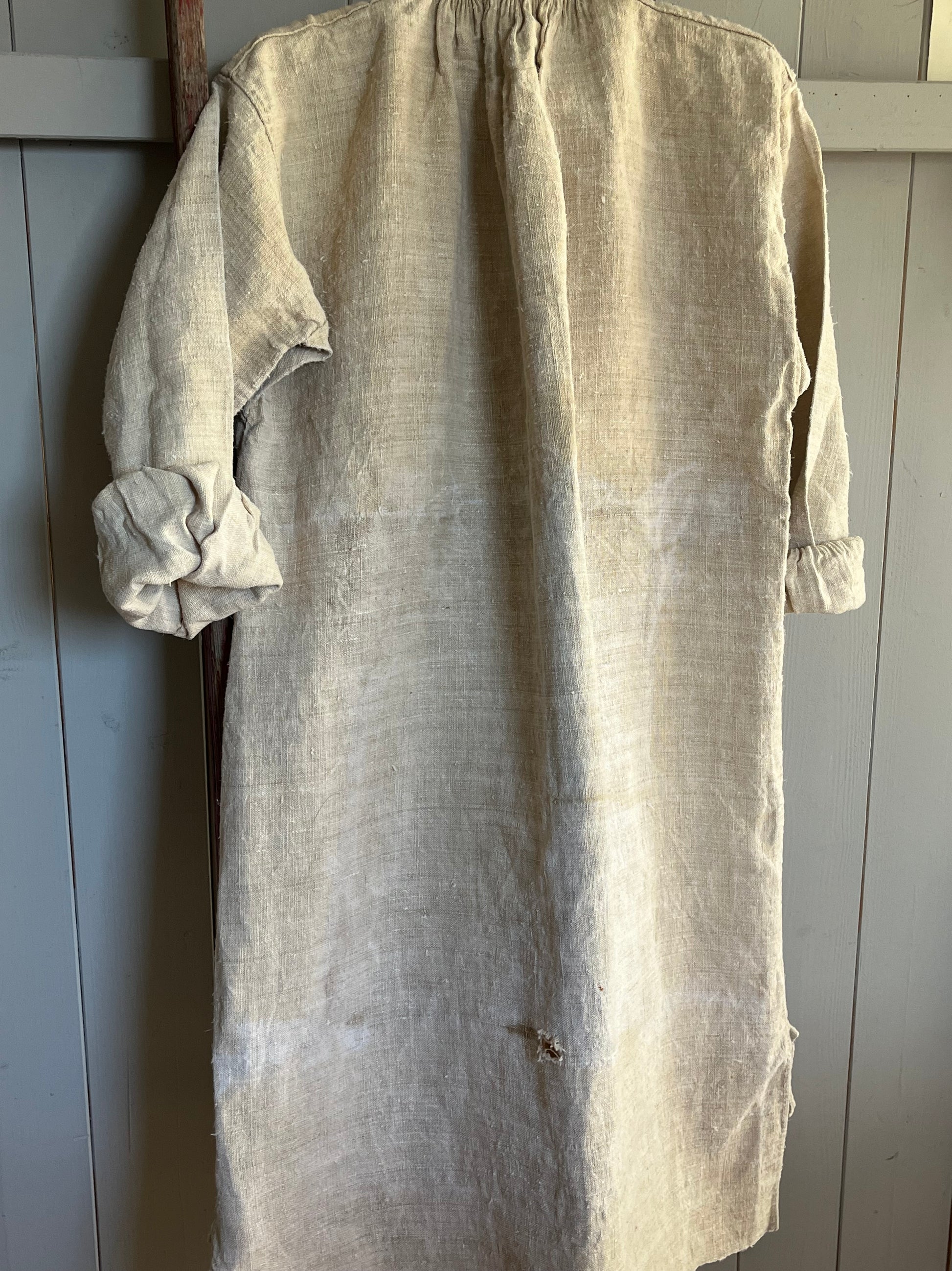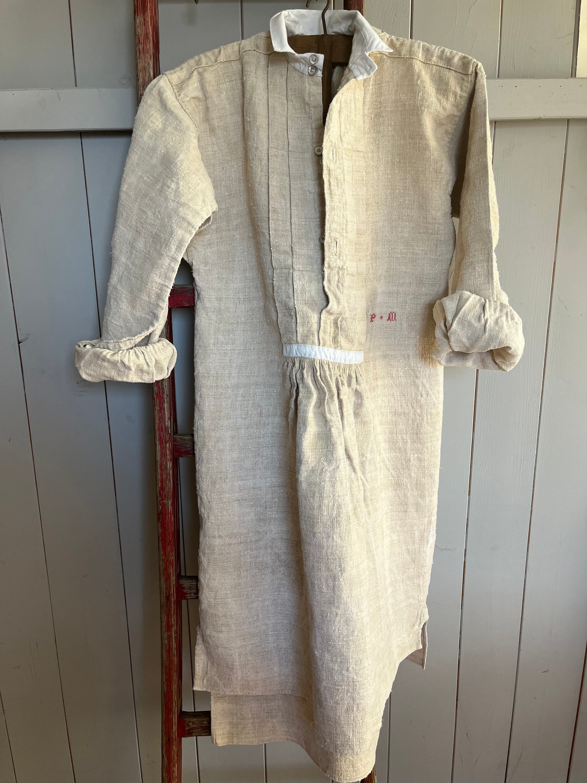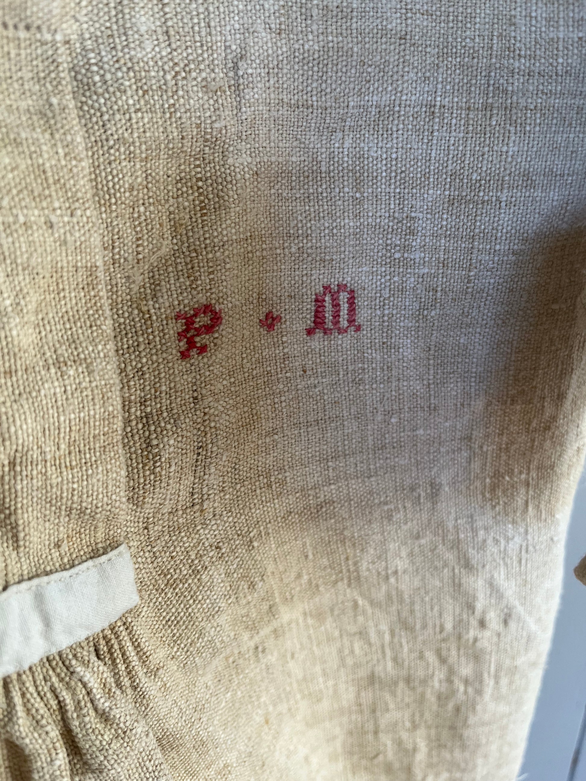 Früher ein Hemd für den Herrn, heute eine Tunika. Dieses schöne Stück wurde aus wunderbarem, altem Hanfstoff genäht - und zwar von Hand. Die Farbe erinnert an Karamell. Das Hemd ist schwer, der Stoff kräftig - es stammt aus Frankreich. Es hat tolle Details. Einen Kragen, ein Monogramm und Faltenlegung im Oberteil . Es wird hier ausdrücklich als Hemd zum Verarbeiten angeboten, denn im Rückteil hat es ein Loch. Man kann das schöne alte Stück kürzen, so dass es ein Oberteil ergibt oder aus dem Stoff etwas Anderes anfertigen. Es ist auch ein außergewöhnliches Dekostück.