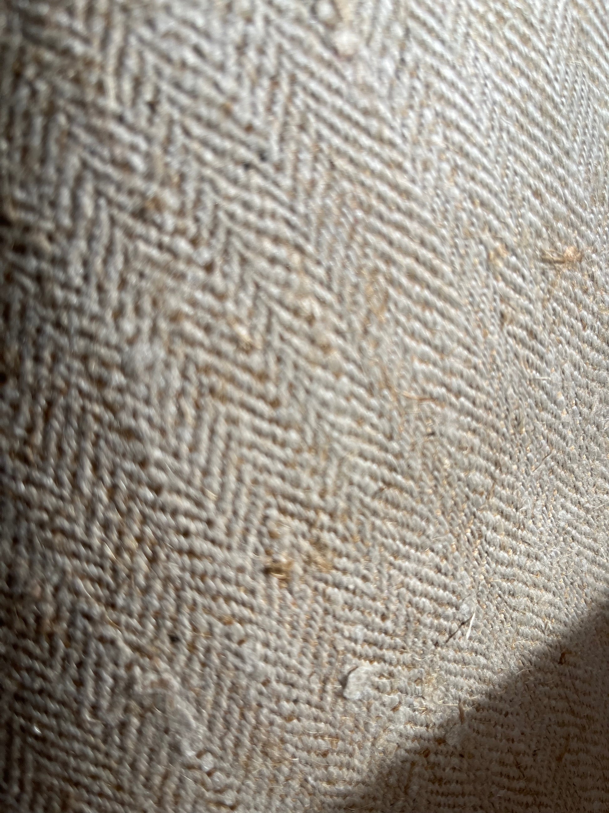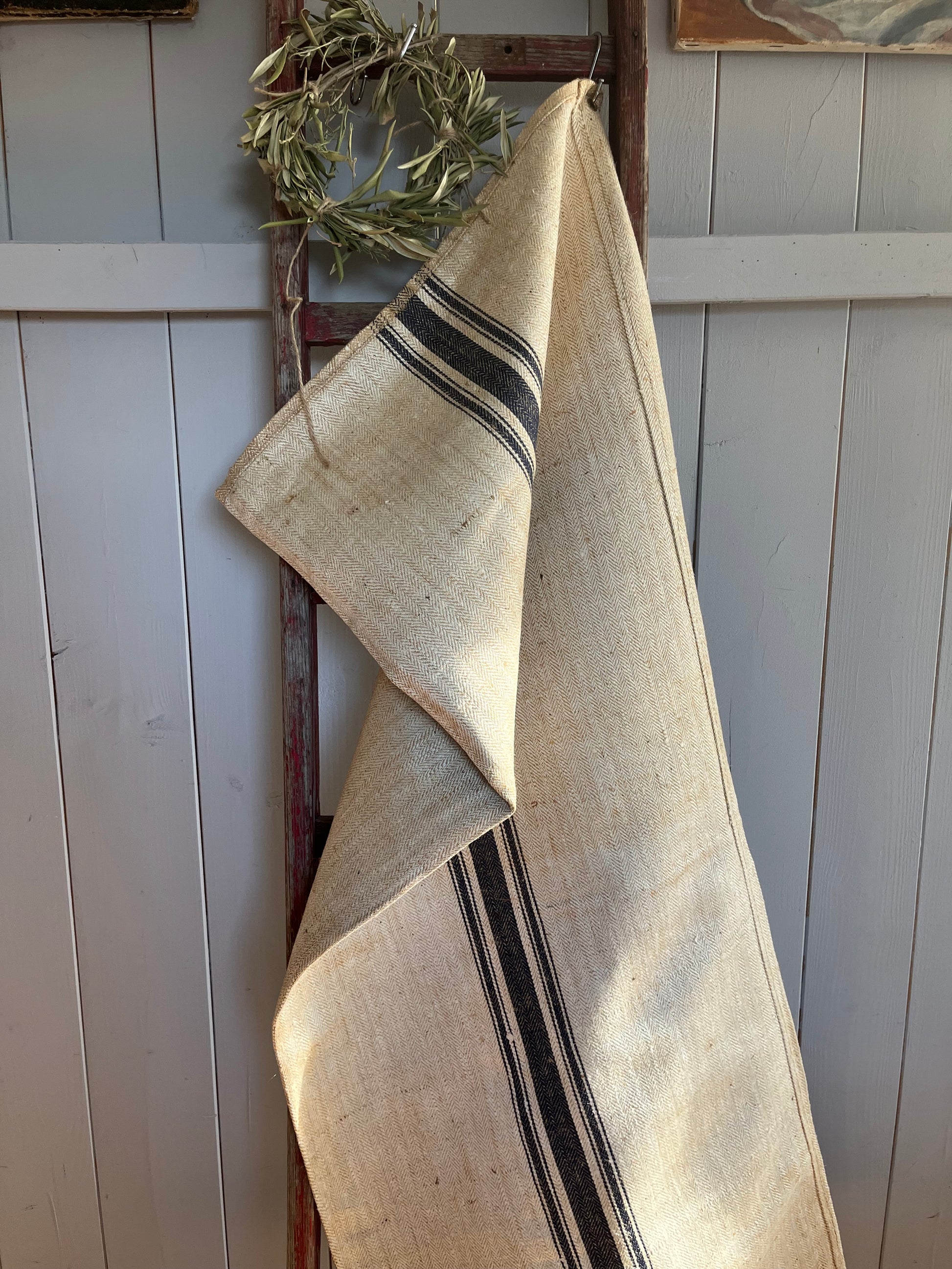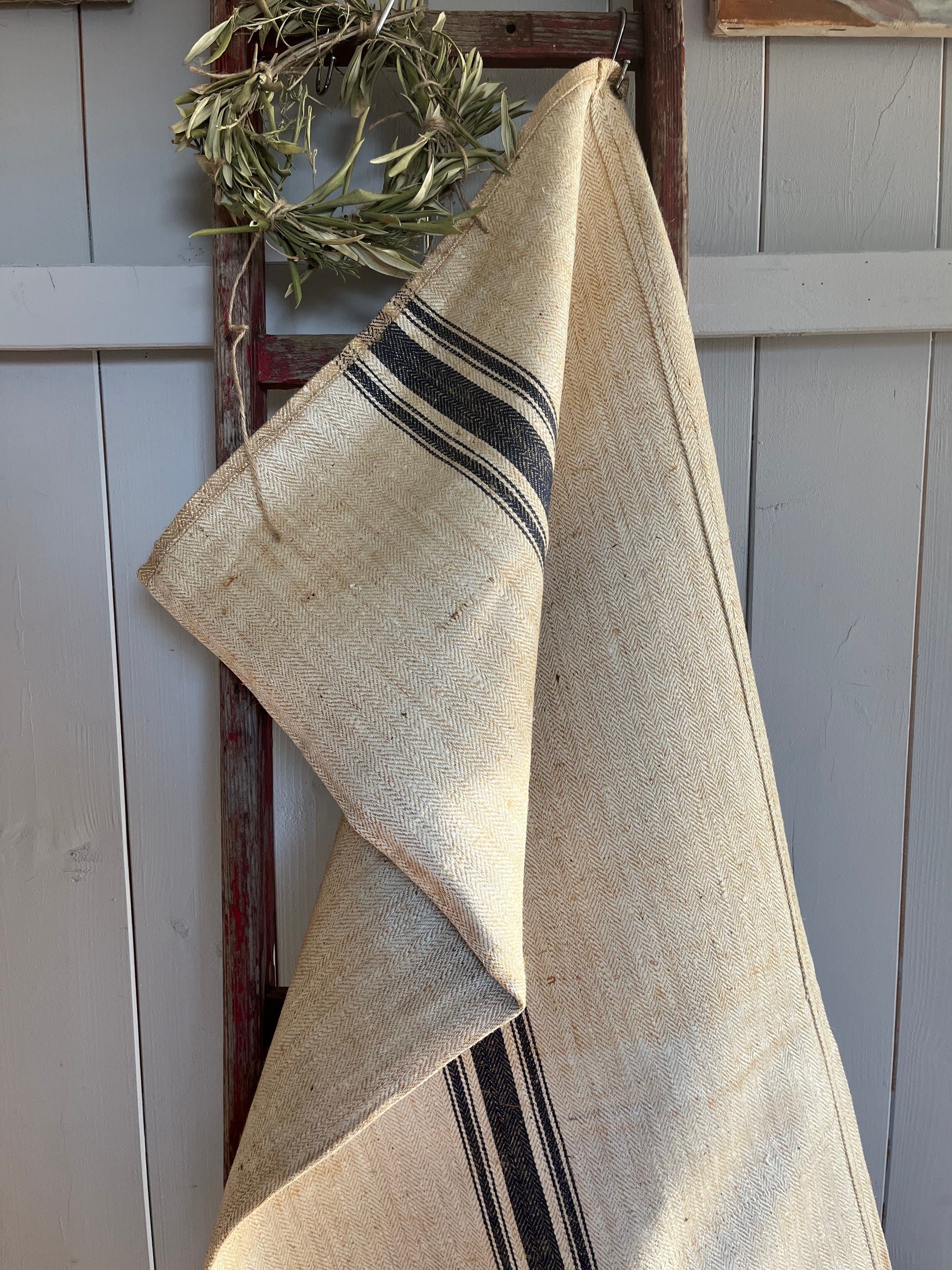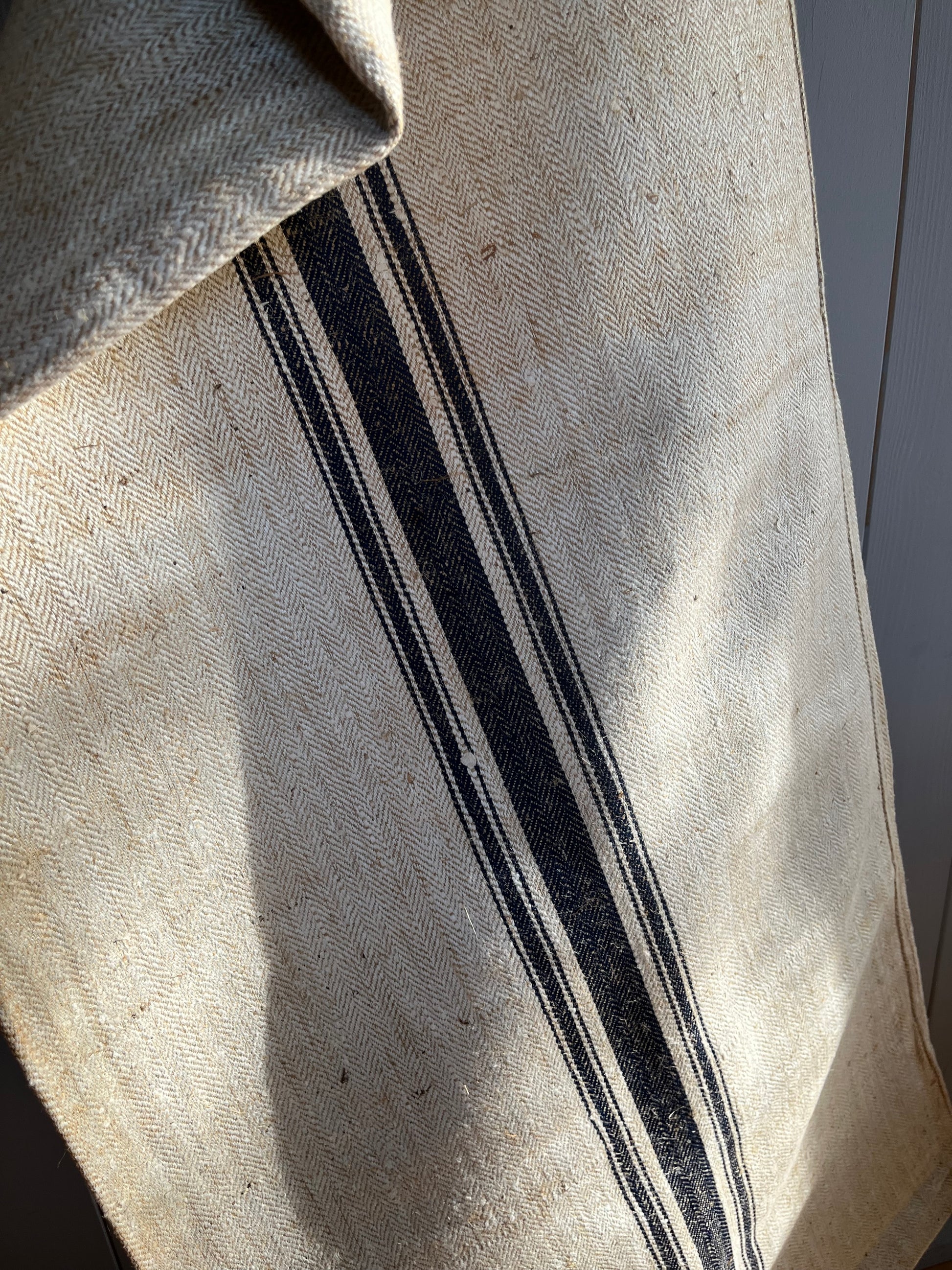 Dieser Bilderbuch-Leinensack stammt aus den Anfängen des 20. Jahrhunderts. Er hat mittig blaue Streifen und Fischgrätwebung. Das Leinen ist fest und glatt. Der Sack wurde nur gelagert, nie benutzt und hat keine gravierenden Mängel, nur etwas Lagerschmutz. Daher: einmal waschen ( geht in der Maschine bei 60 Grad). Und auf der Leine trocknen lassen. Maße: 136 x 50 cm.