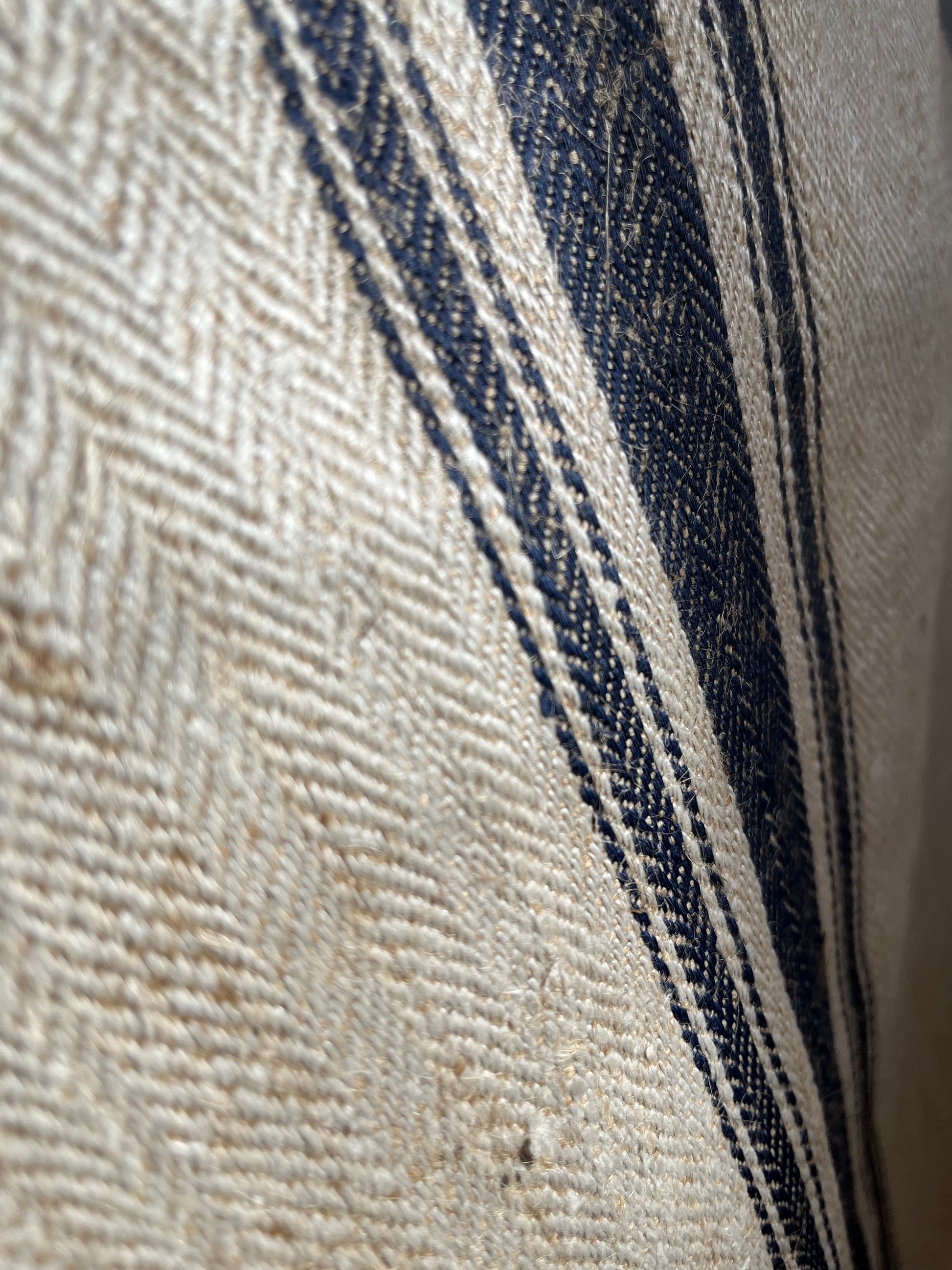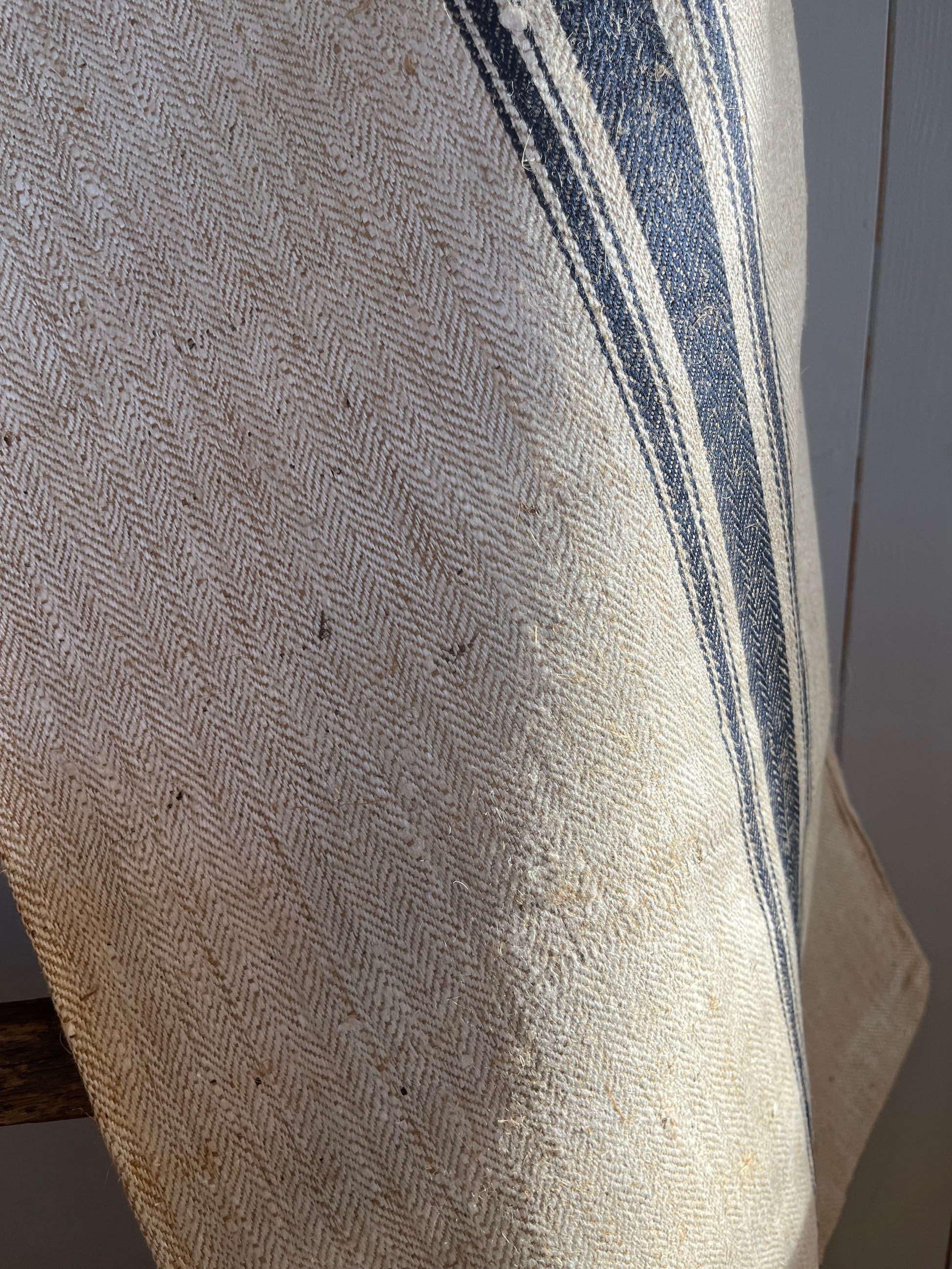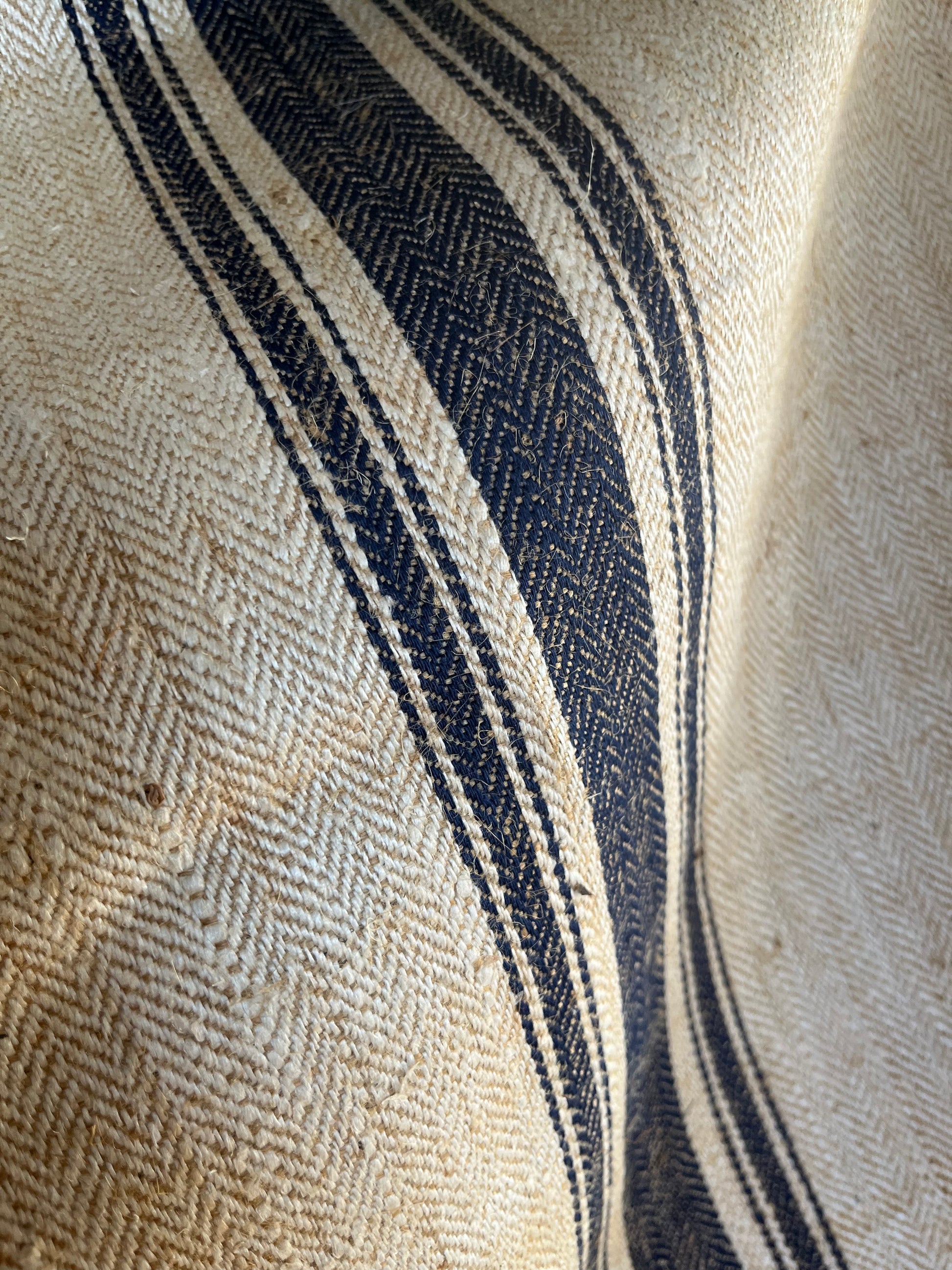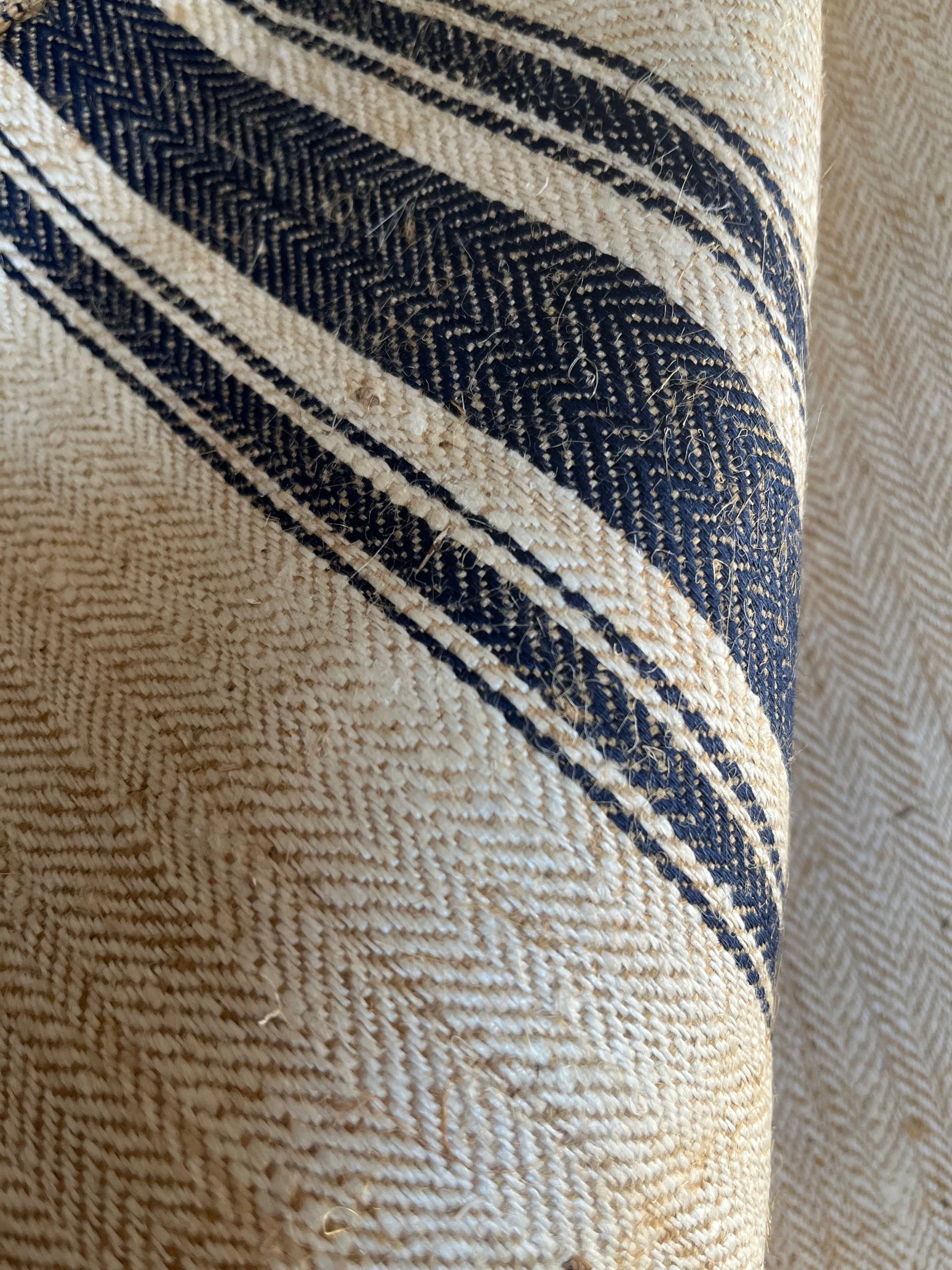 Unbenutzter alter Leinensack mit blauen Streifen und Fischgrätwebung 136 x 50