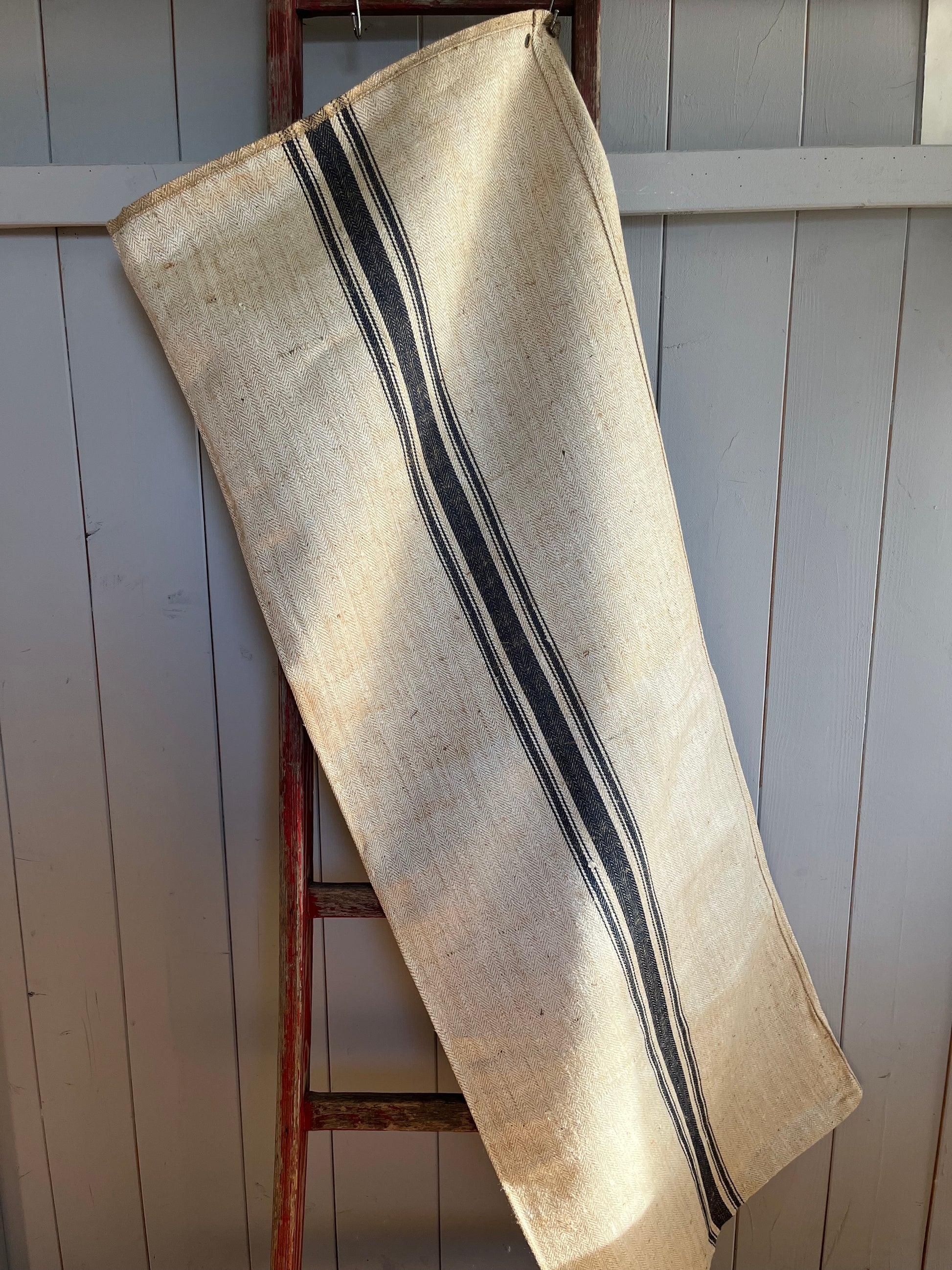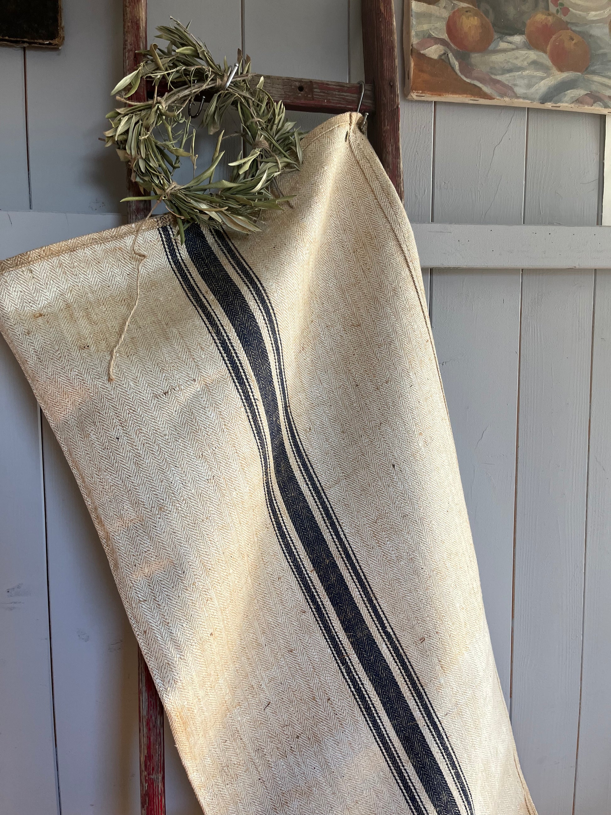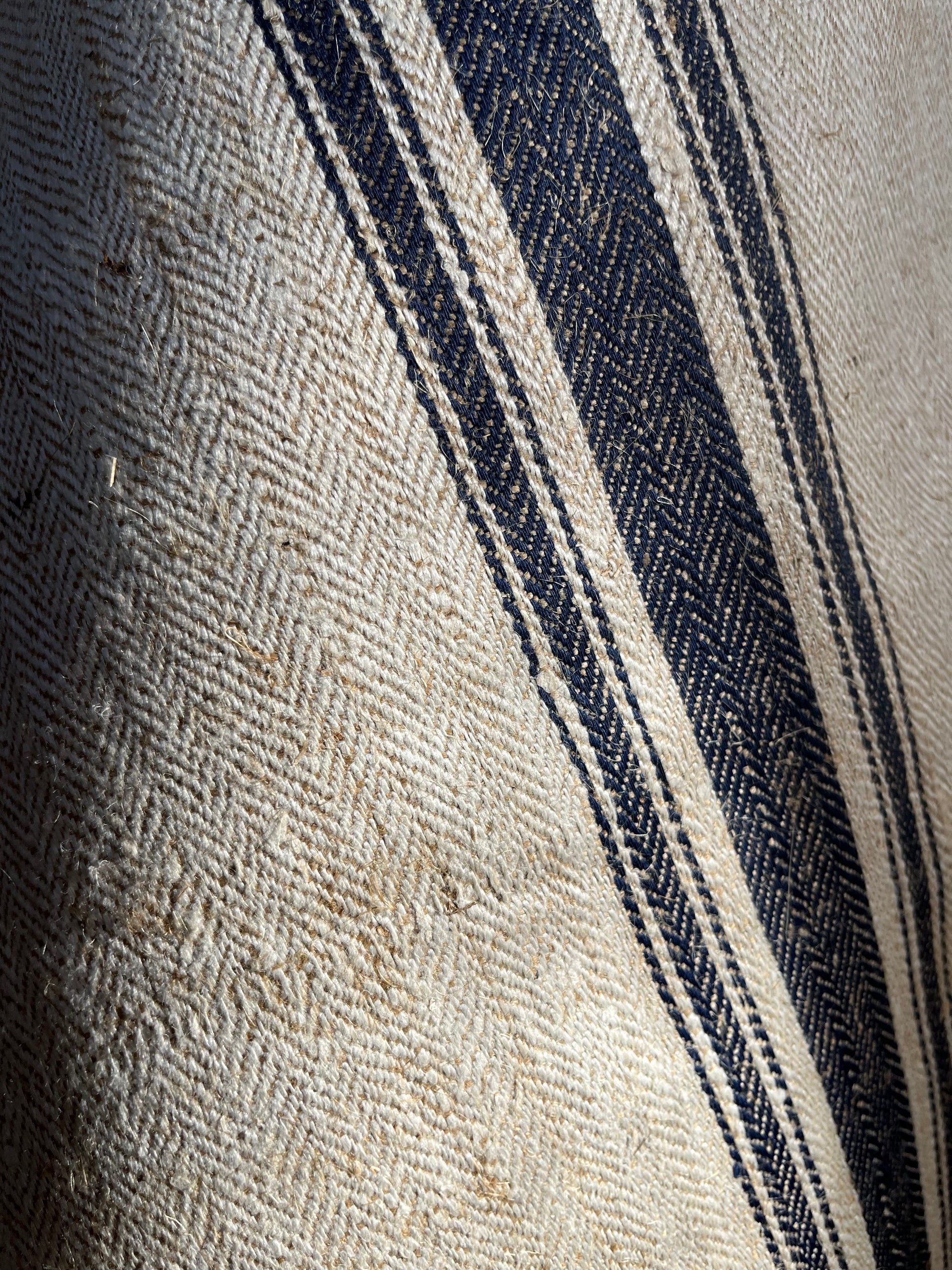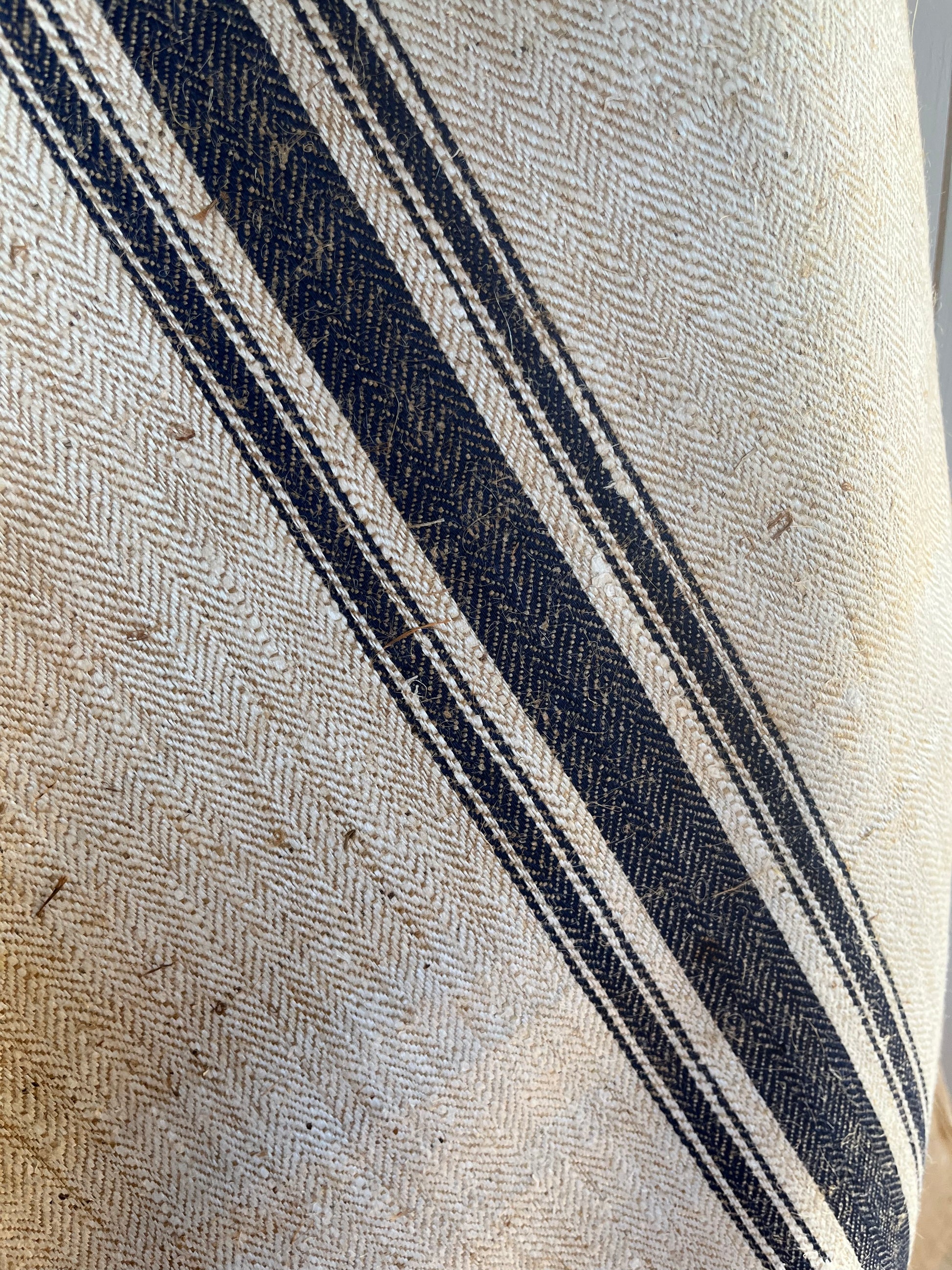 Unbenutzter alter Leinensack mit blauen Streifen und Fischgrätwebung 136 x 50