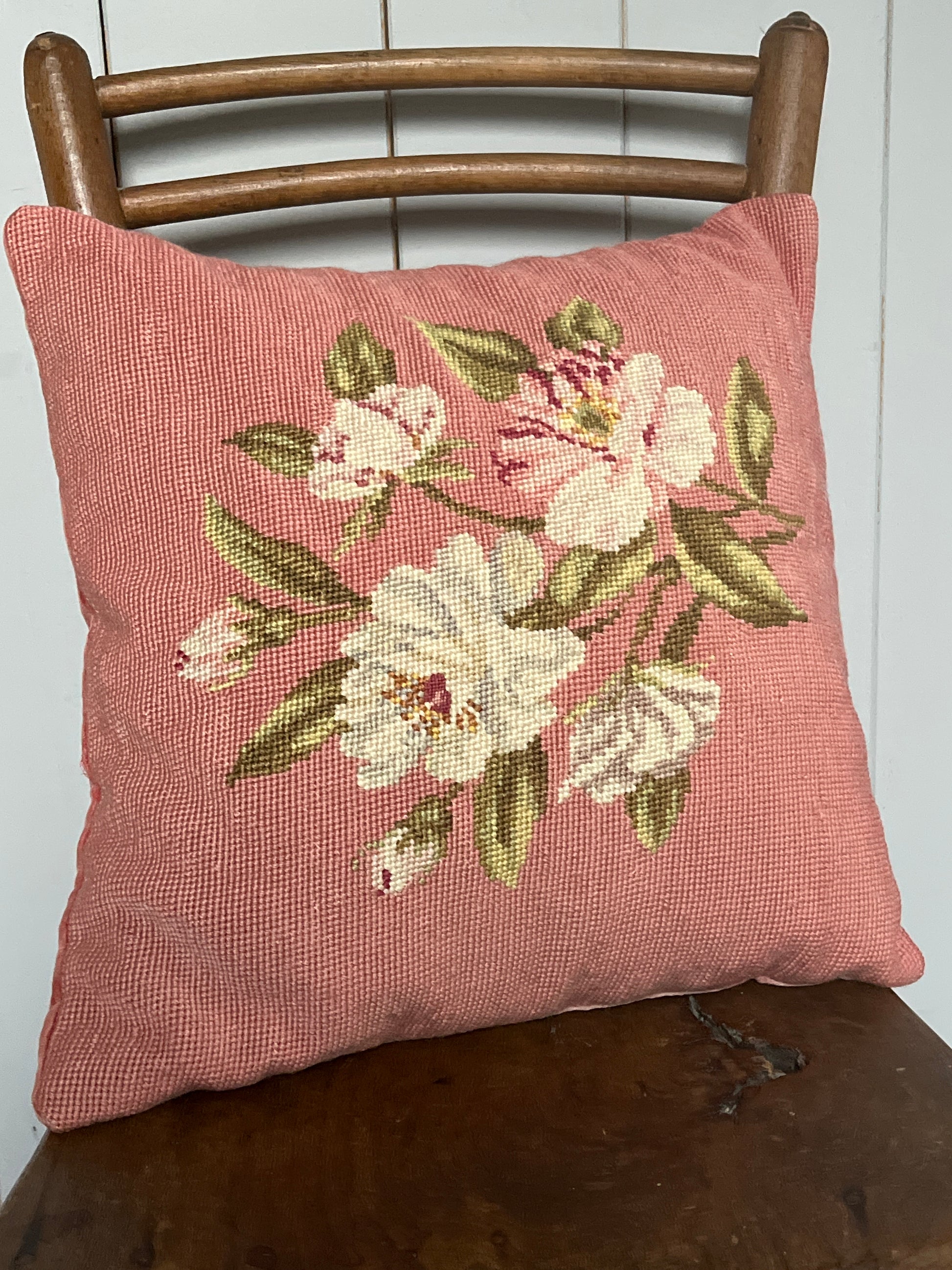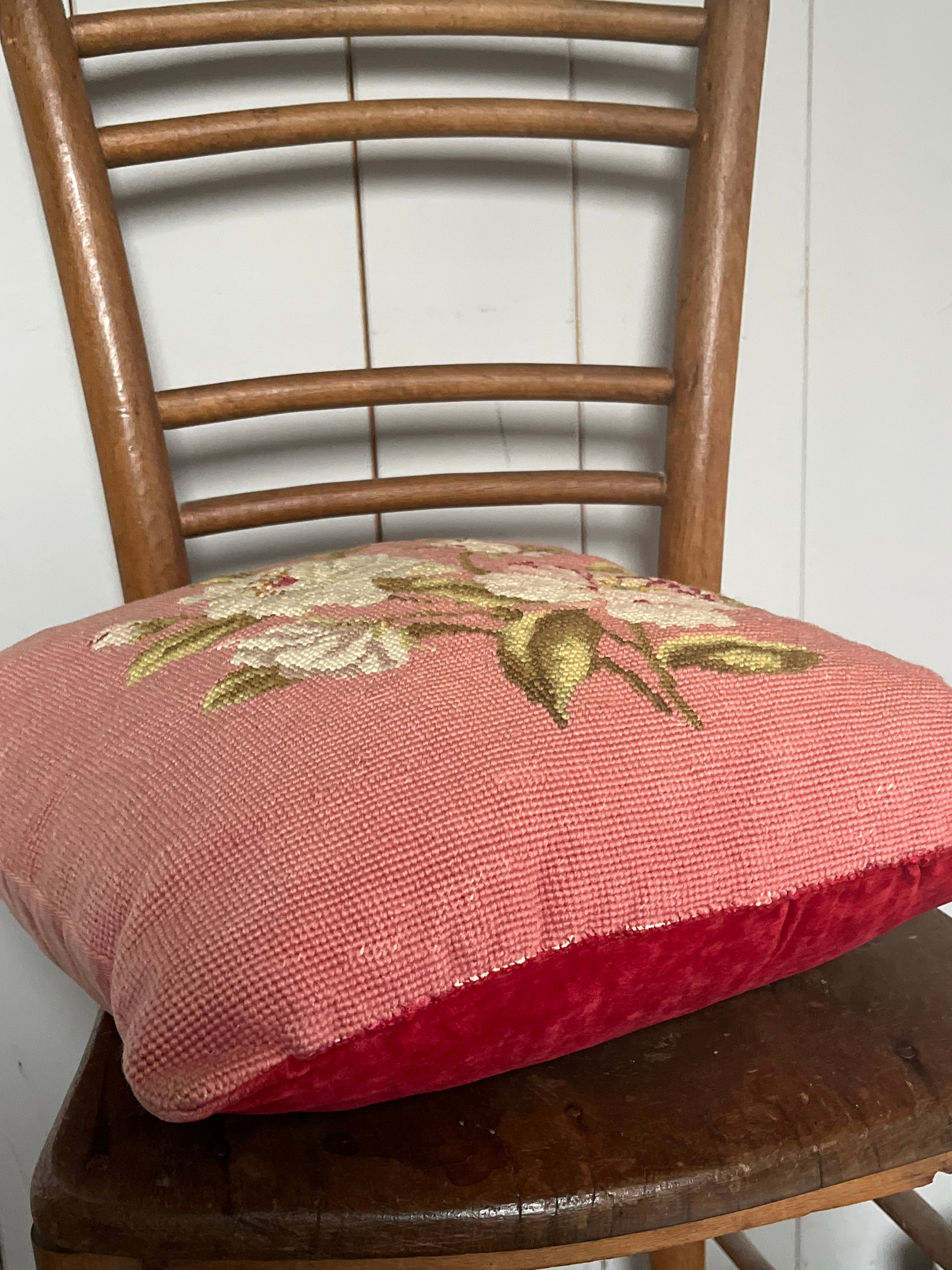 Hier steckt viel Arbeit drin. Dieses schöne Kissen stammt aus Frankreich, es ist von Hand gefertigt. Die Vorderseite zeigt eine akkurate und intakte Stick-Arbeit, Petitpoint. Es sind große Blüten auf rosefarbenem Hintergrund. Die Rückseite ist hochwertiger Samt in dunkelrot. Das Kissen wurde zusammengenäht von Hand und ist geschlossen. Die Füllung ist mir nicht bekannt, es fühlt sich an wie eine Füllung aus Stoffresten. Recht schwer, aber weich. Man könnte das Kissen auftrennen, einen Reißverschluss einnähen und mit einer herkömmlichen Füllung versehen. Maße etwa 40 × 40 cm. Ein prächtiges Stück Handarbeit.