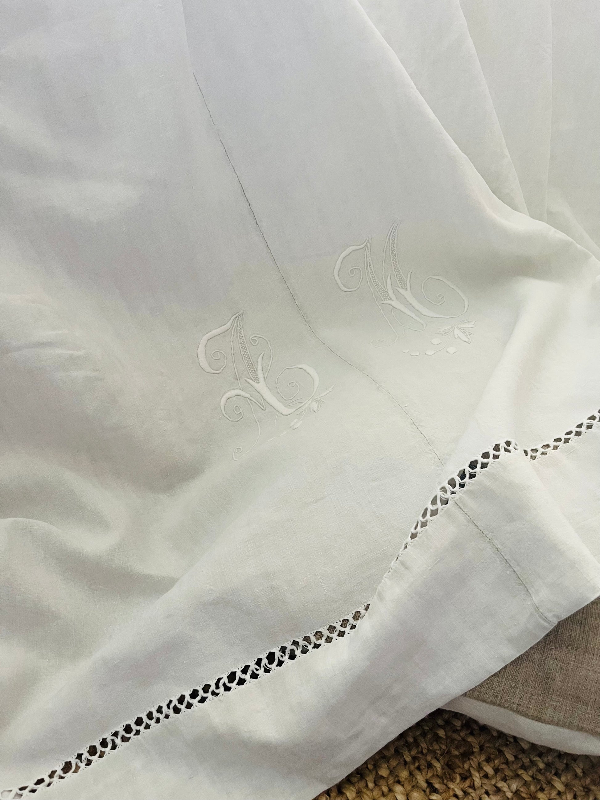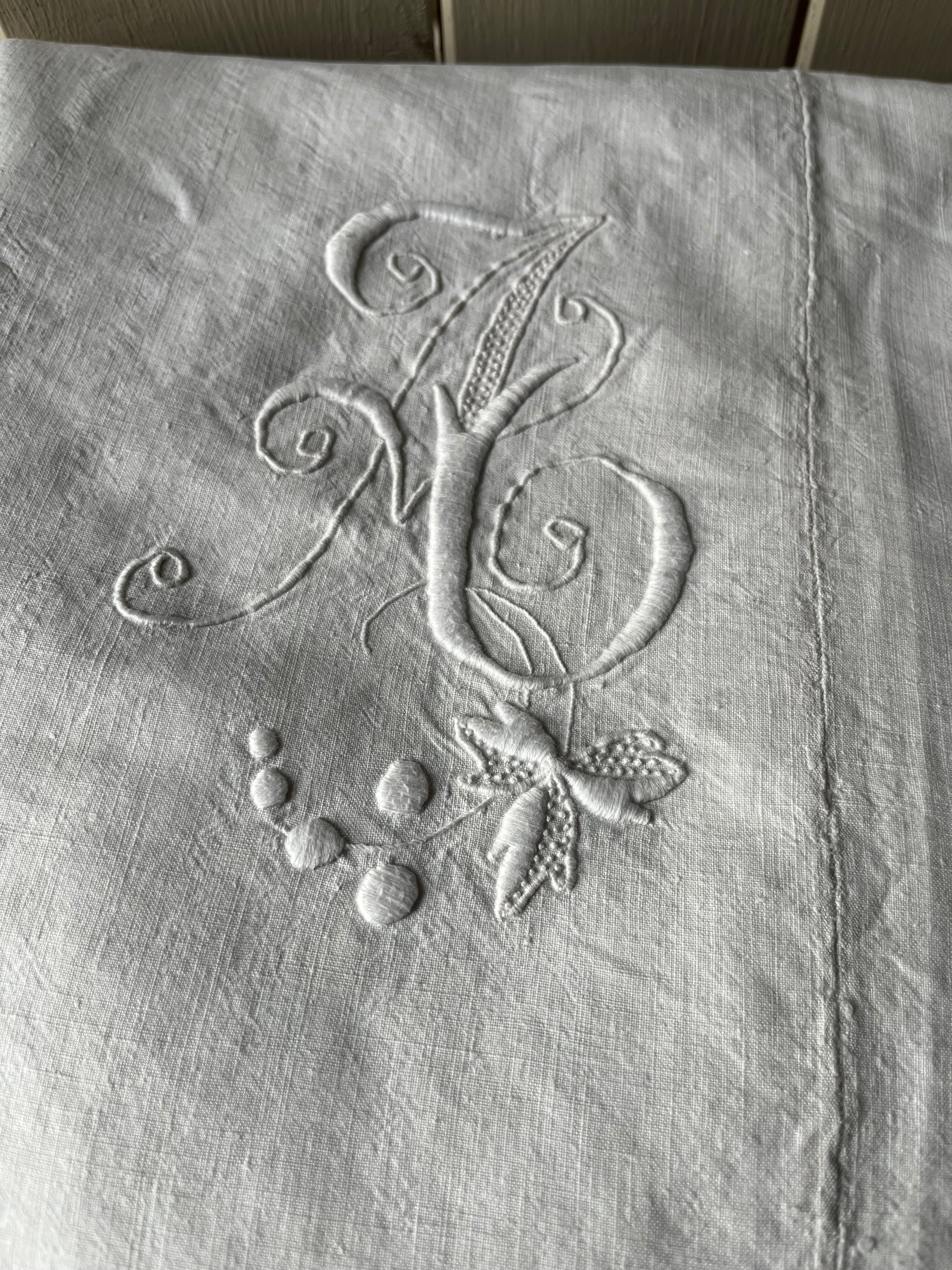 XL Leinen Laken aus Frankreich mit großem Monogramm und Hohlsaum