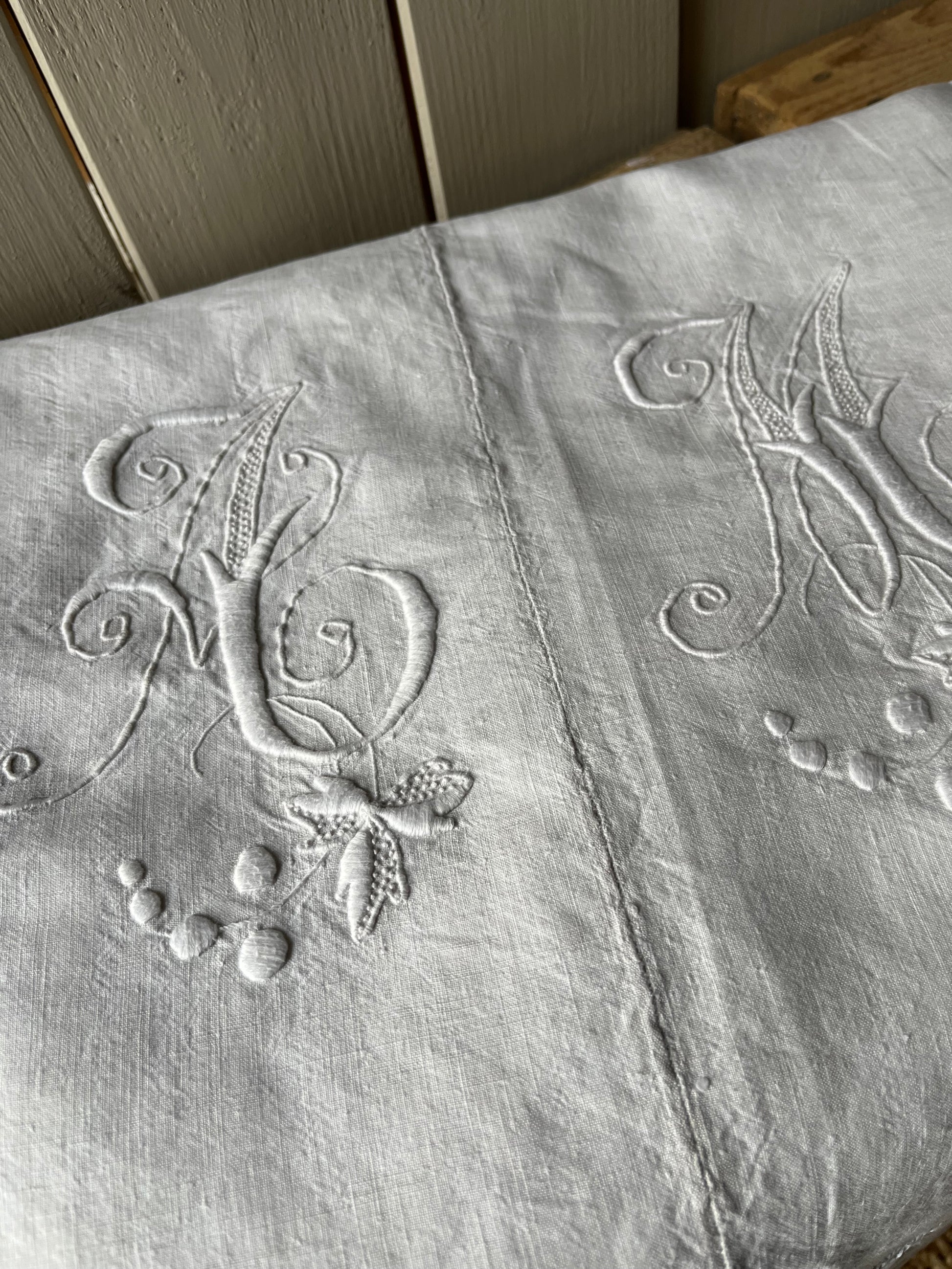 Solche Laken sind kaum noch zu finden. Schon gar nicht in einem so schönen Zustand. Es ist sattes, altes Leinen. In einem schönen Ton zwischen beige und grau. Das Laken fällt schön schwer, misst etwa 3 × 2 m. Es wurde mittig aus zwei Bahnen zusammengenäht. Das war früher so üblich. Auf der Umschlagseite finden sich ein fantastisches, von Hand gesticktes Monogramm: A und M. Sowie eine breite und schöne Hohlsaumborte. Das Laken ist in einem tollen Zustand, ich habe einen kleinen Lagerfleck seitlich unten entdeckt, der absolut nicht ins Auge fällt.