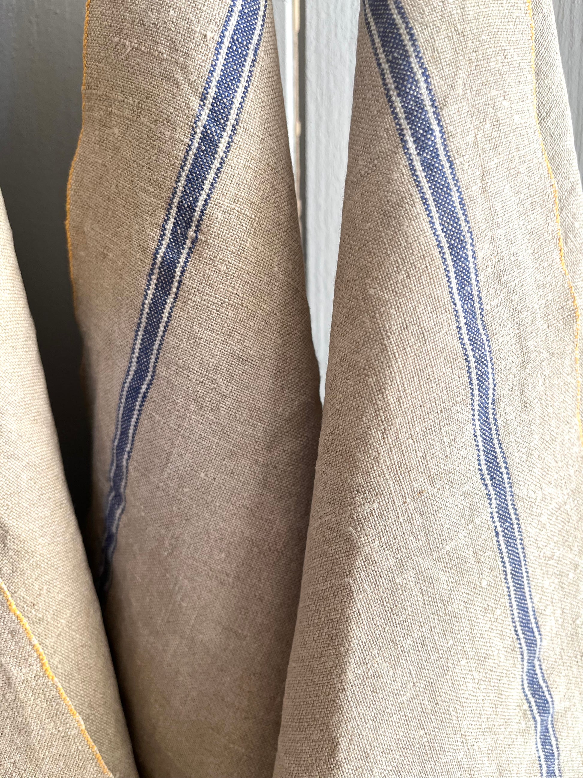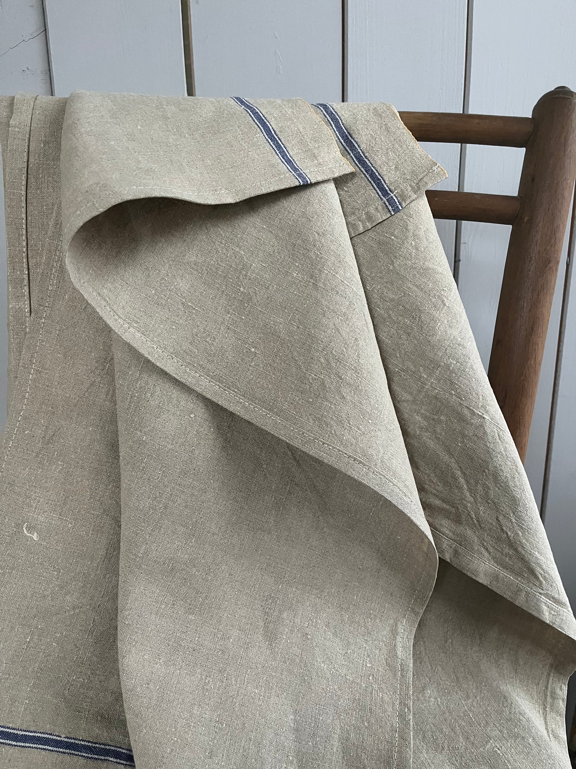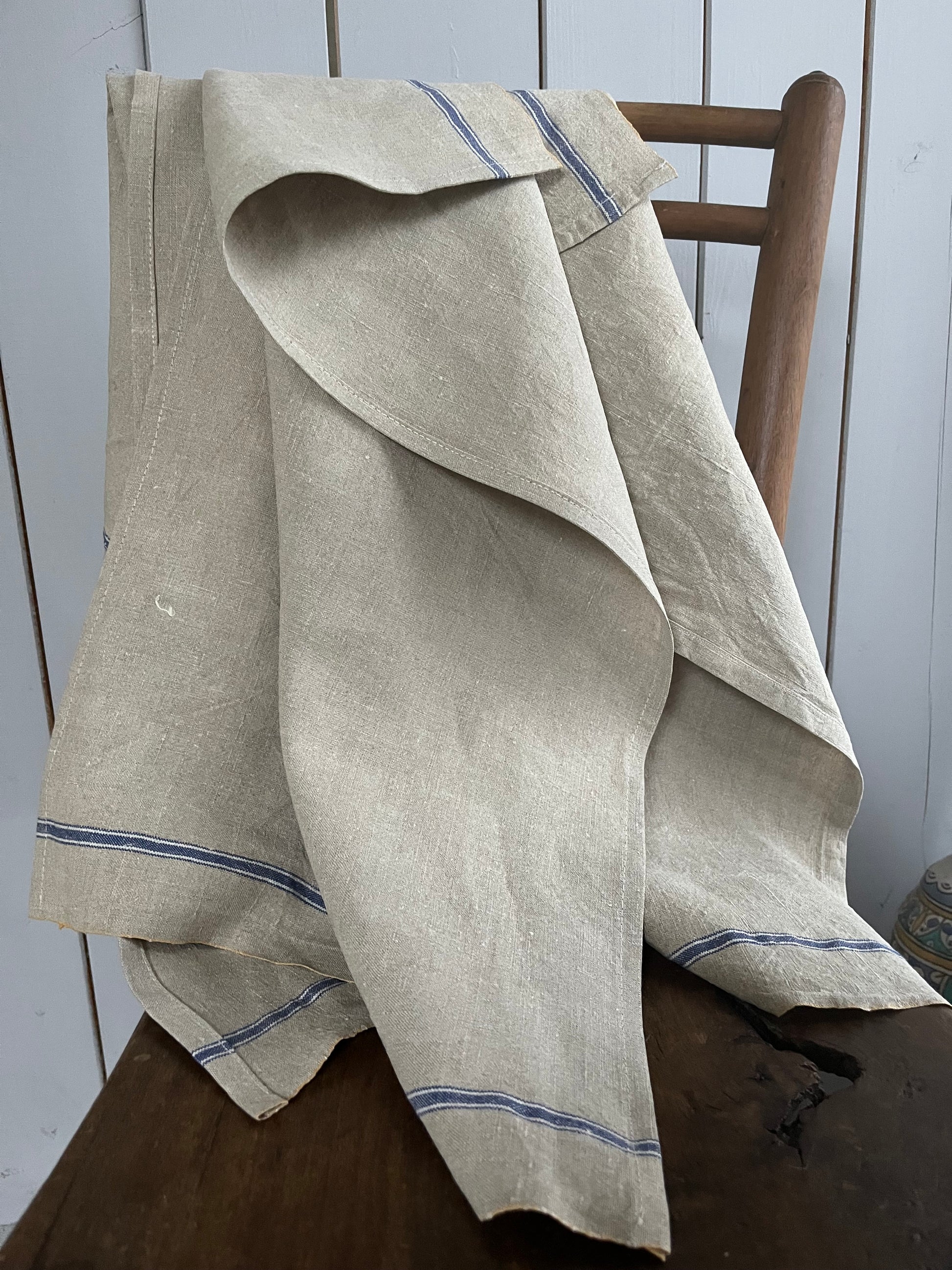 Aus altem Leinen genähtes Tuch mit dunkelblauen und weißen Streifen oben und unten. Maße: ca. 83 × 45 cm. Leinenfarbe: ein dunkles Beige. Das Tuch ist toll erhalten. Aber immer bedenken: es ist antikes, altes Leinen, Lagerspuren können immer mal irgendwo auftauchen. Sie machen den Charme der alten Stücke aus. Unbenutzt. Auch als Tischläufer zu verwenden. Aufhänger vorhanden.