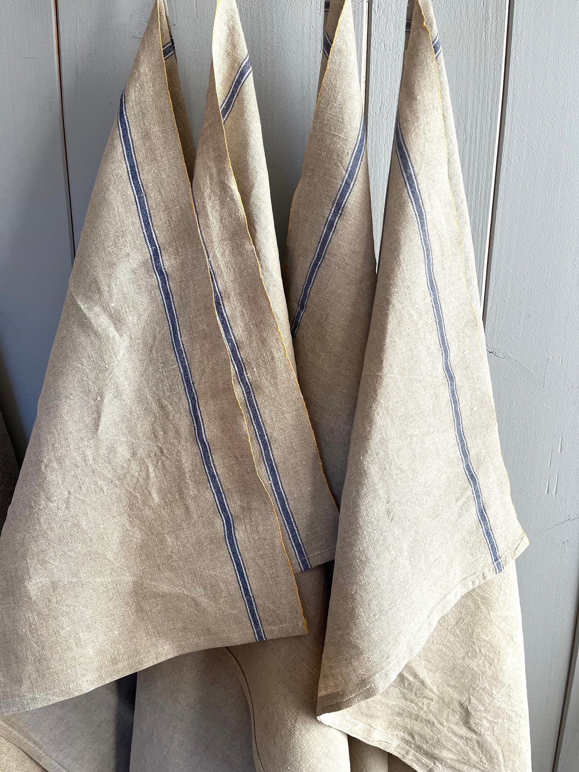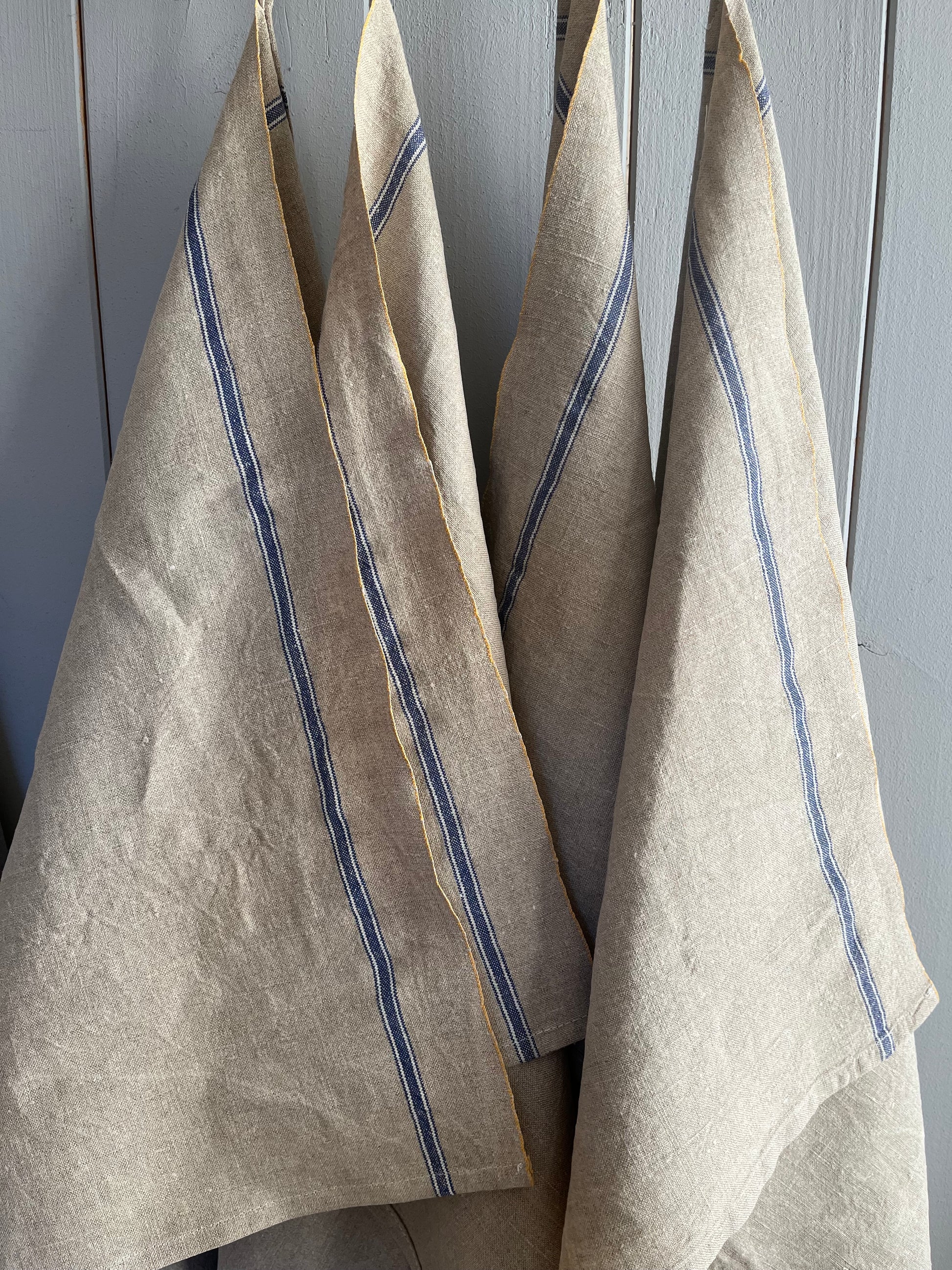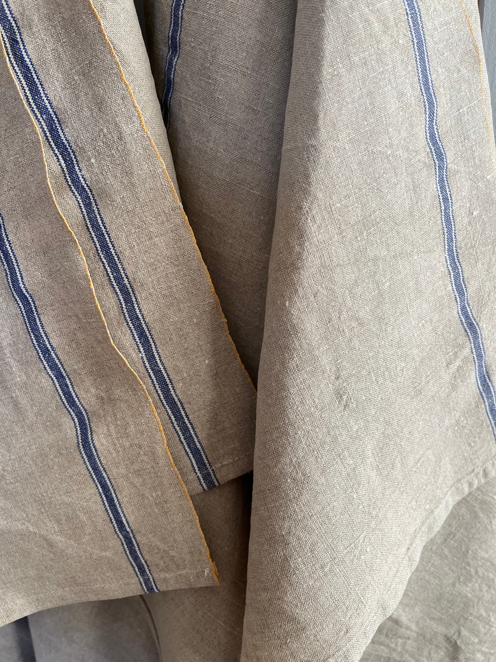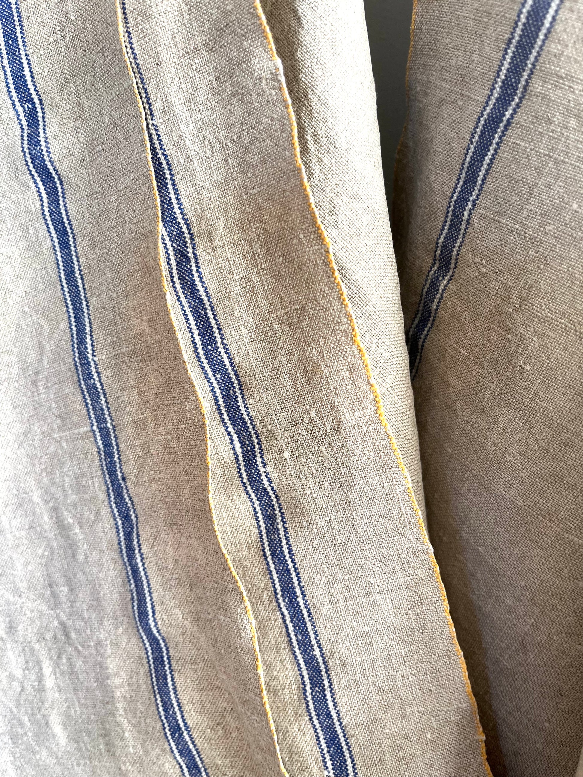 Aus altem Leinen genähtes Tuch mit dunkelblauen und weißen Streifen oben und unten. Maße: ca. 83 × 45 cm. Leinenfarbe: ein dunkles Beige. Das Tuch ist toll erhalten. Aber immer bedenken: es ist antikes, altes Leinen, Lagerspuren können immer mal irgendwo auftauchen. Sie machen den Charme der alten Stücke aus. Unbenutzt. Auch als Tischläufer zu verwenden. Aufhänger vorhanden.